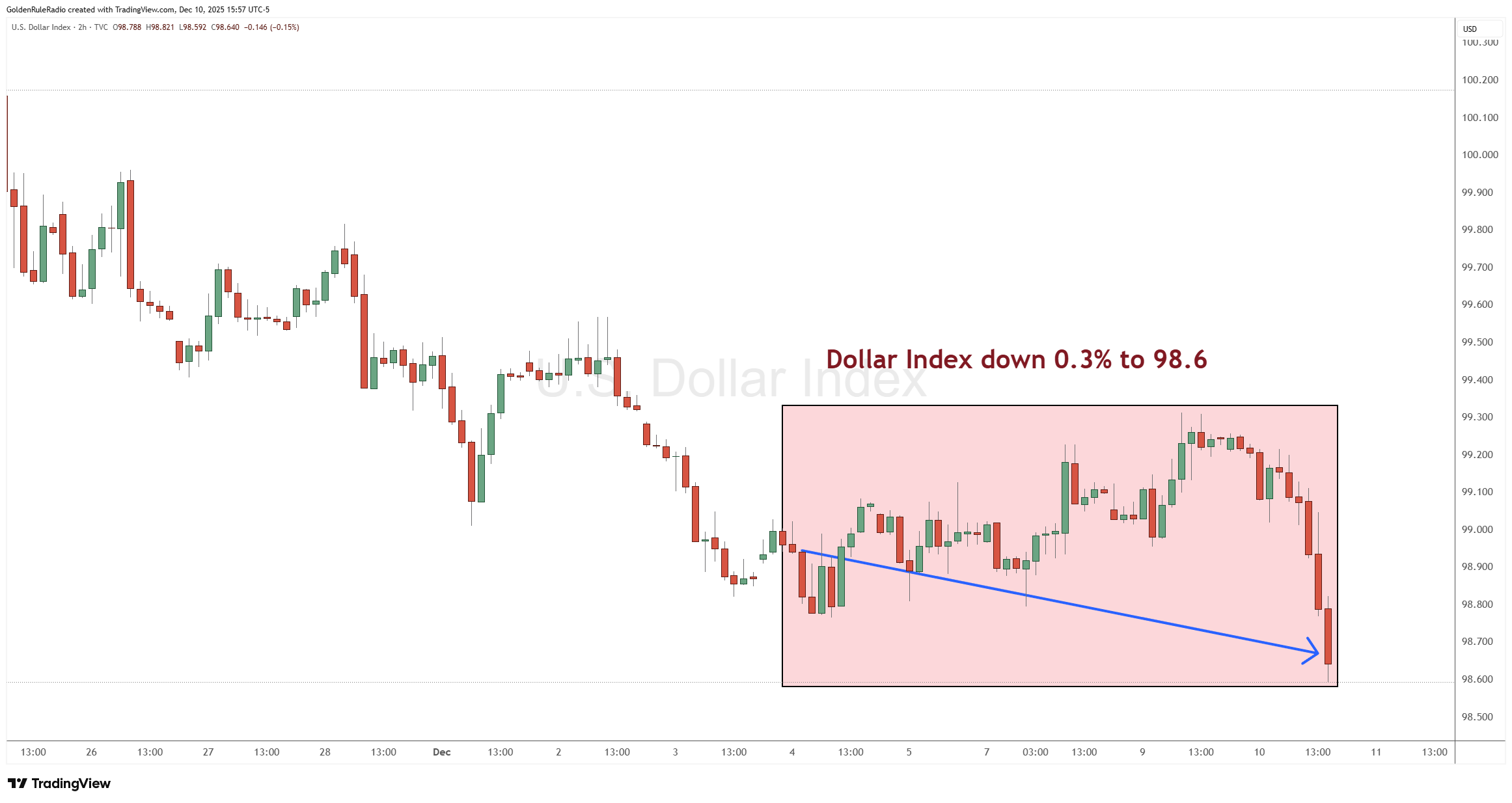 The US dollar index is down about 0.3% sitting at 98.6. It was flat up until a couple hours before recording when the Fed announced a 0.25% interest rate decline.