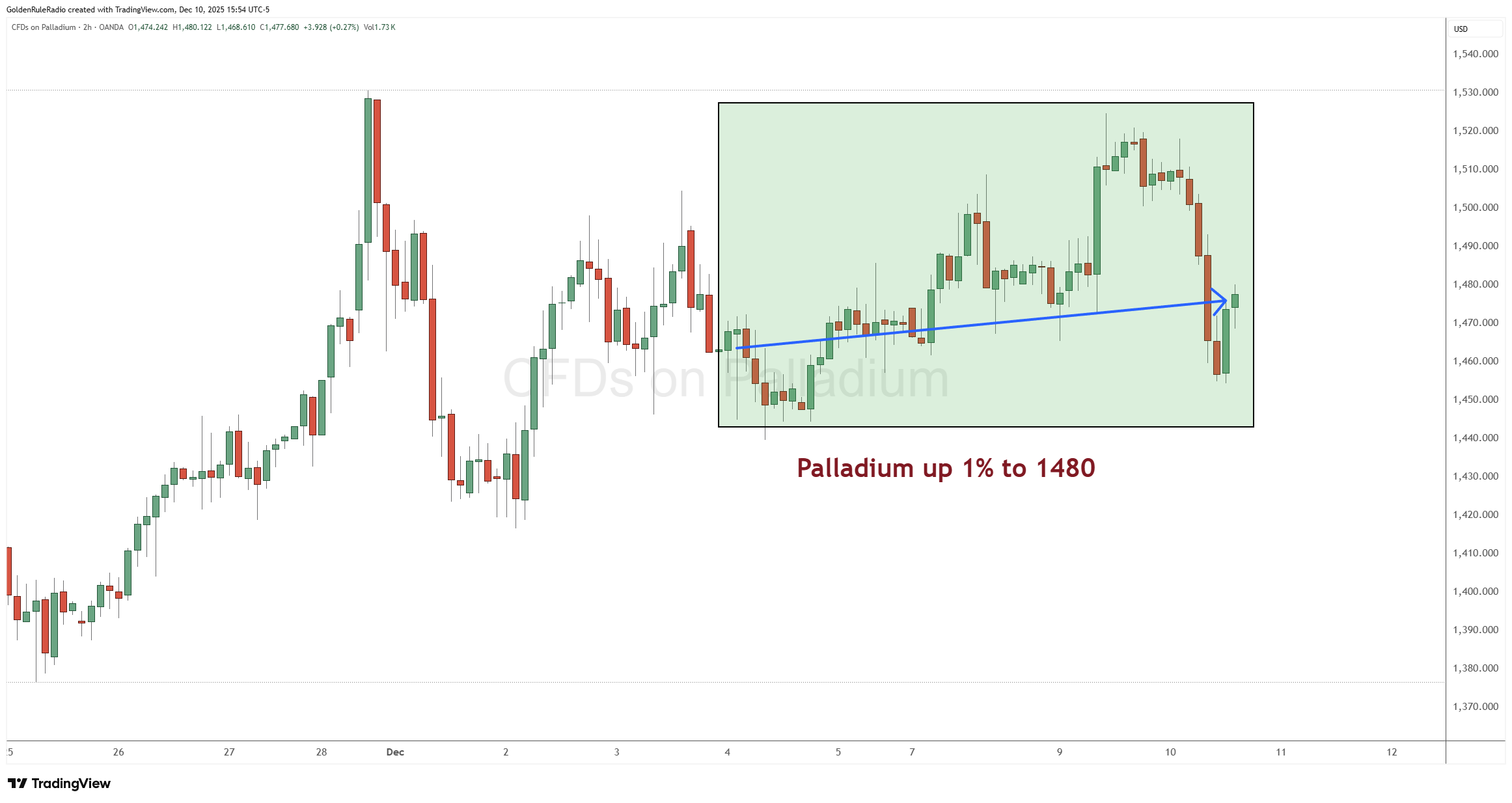 Palladium is also up about 1% at $1,480, almost $200 below platinum.