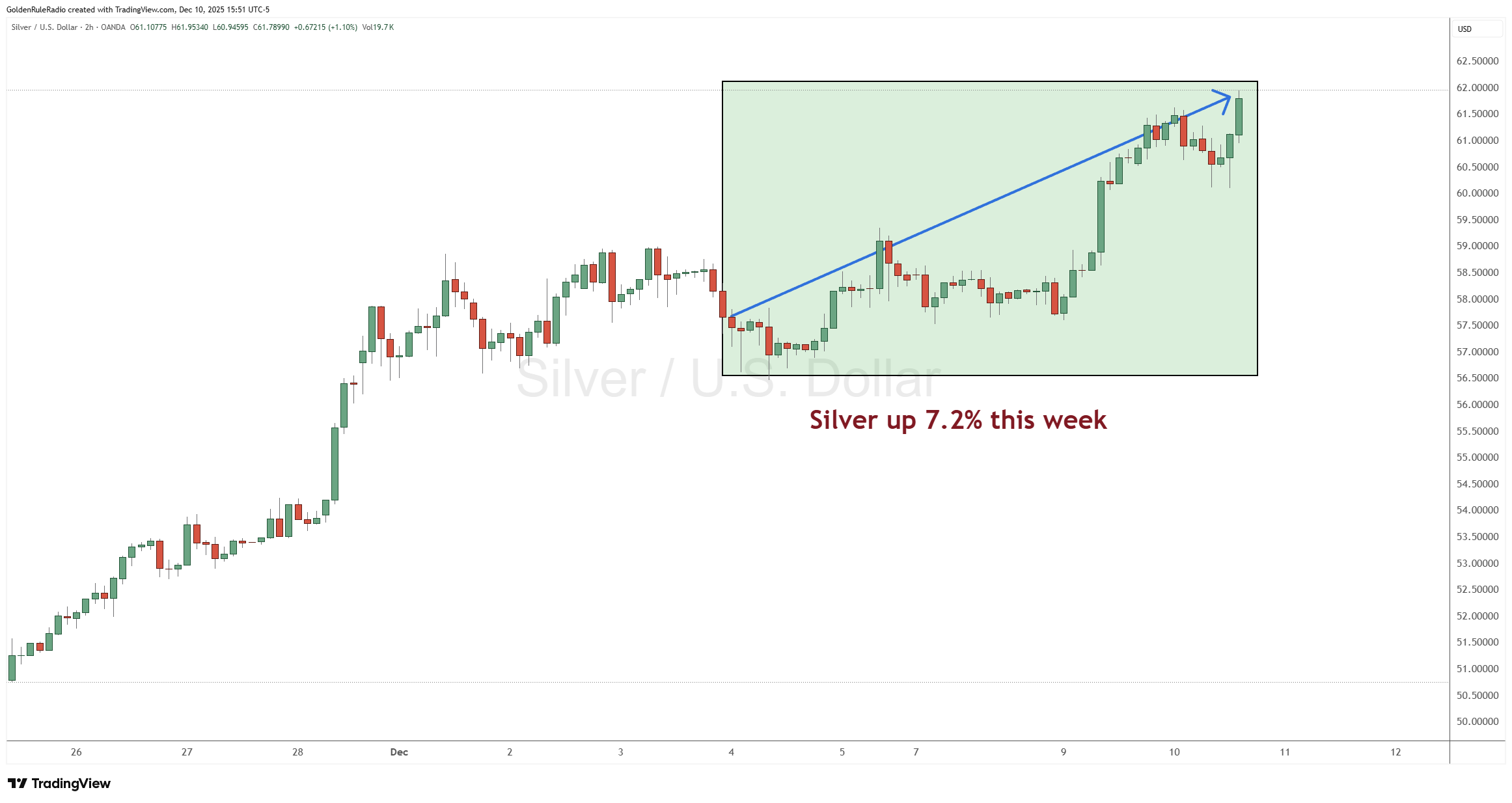 Silver is up about 7.5%, sitting at $61.80 and putting in a new all time high. Around this time last year, silver was still in the $20+ range.