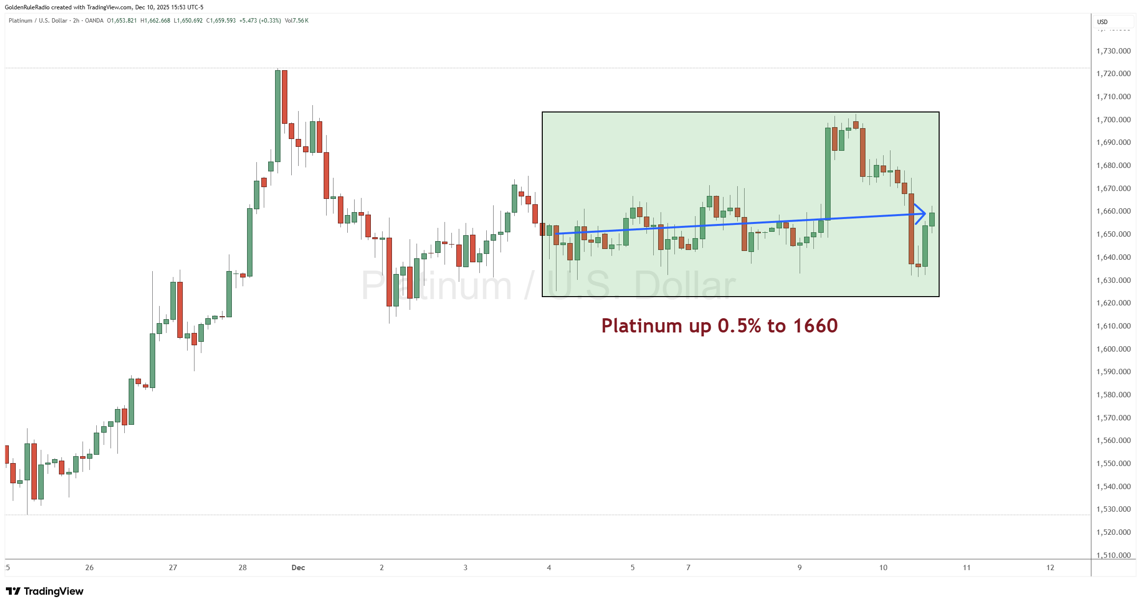 Platinum is up about 1%, sitting at $1,660. The white metal hit $1700 an ounce yesterday, but it just didn’t stay there.