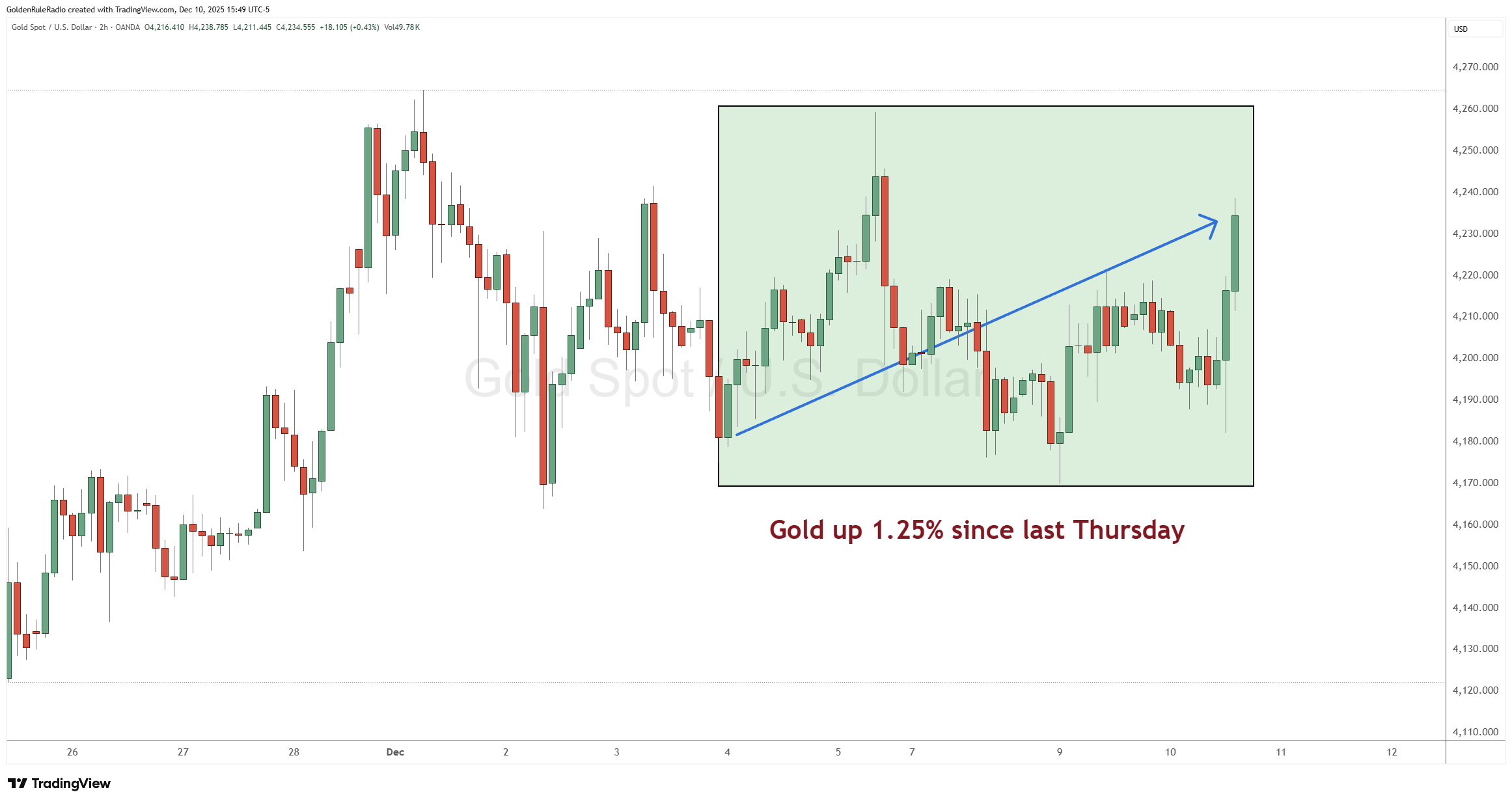 The price of gold is up 1.25% sitting at $4,230. Much of that rise is on the heels of the Fed announcement, but still kind of locked in this sideways trading channel.