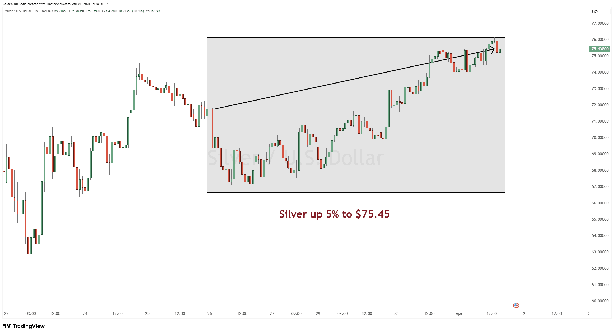 The price of silver is up over 5%, sitting at $75.45. It’s moving back towards the middle of its big trading range.