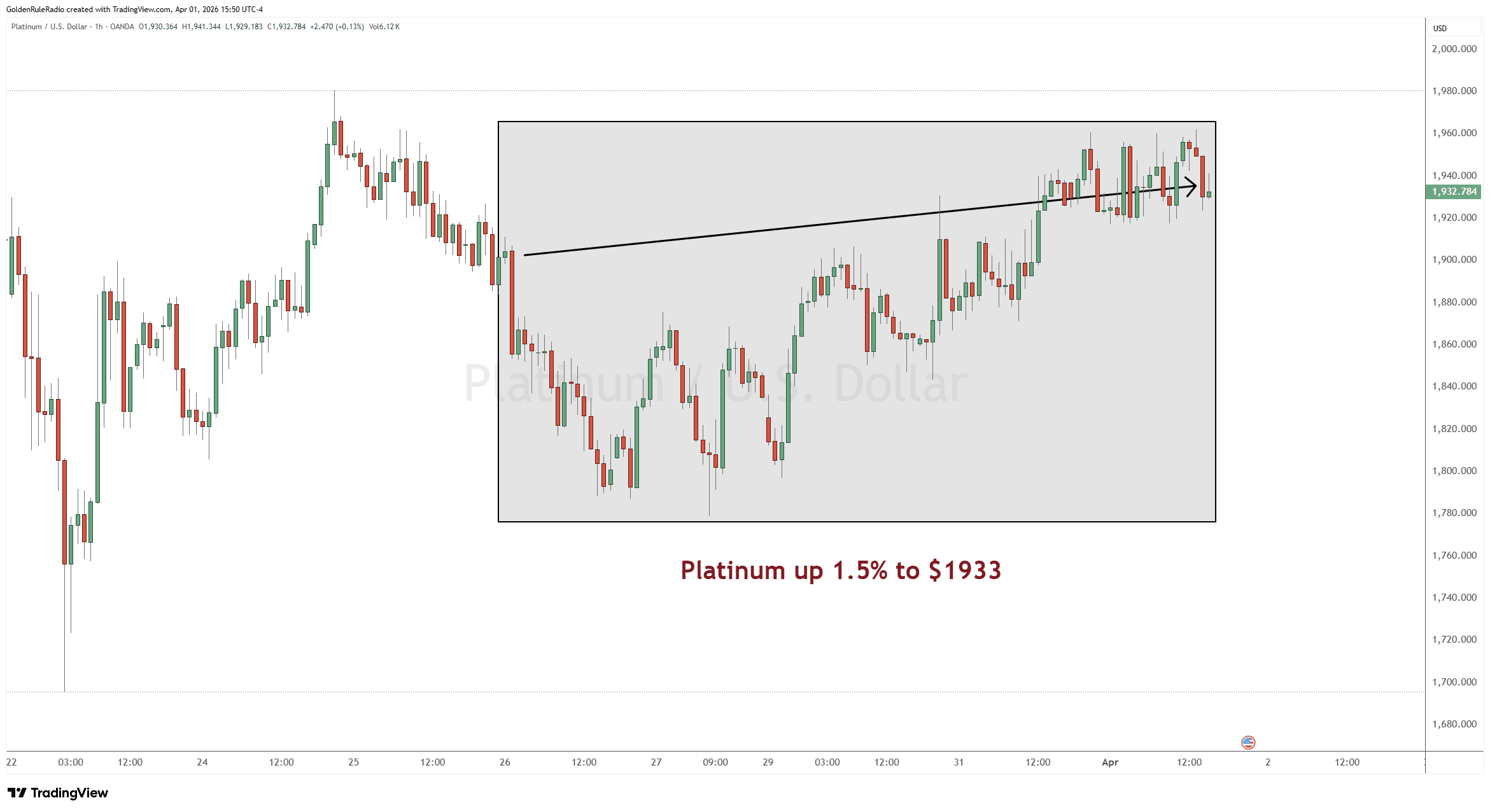 Platinum is up 1.6%, sitting at $1,933 — still under $2,000 an ounce.