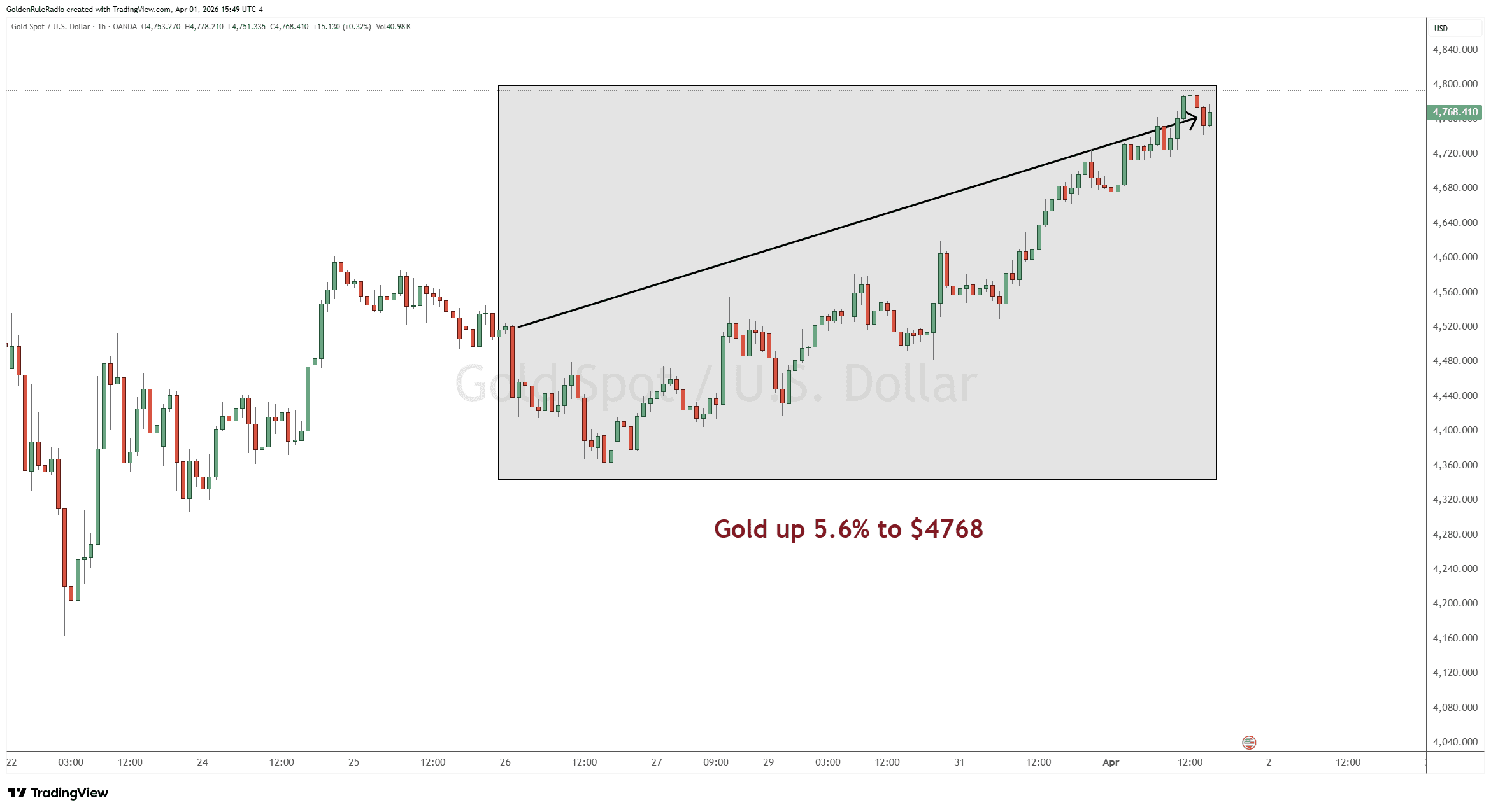 The price of gold is up about 5.6% on the week, sitting at $4,768. That’s an increase of around 7% since gold hit the bottom.