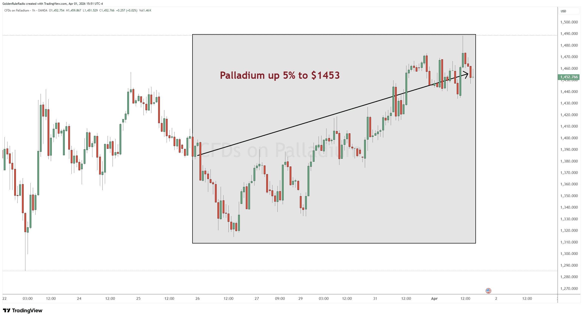 Palladium is up about 5%, currently at $1,453. It’s still sitting about $500 below sister metal platinum.