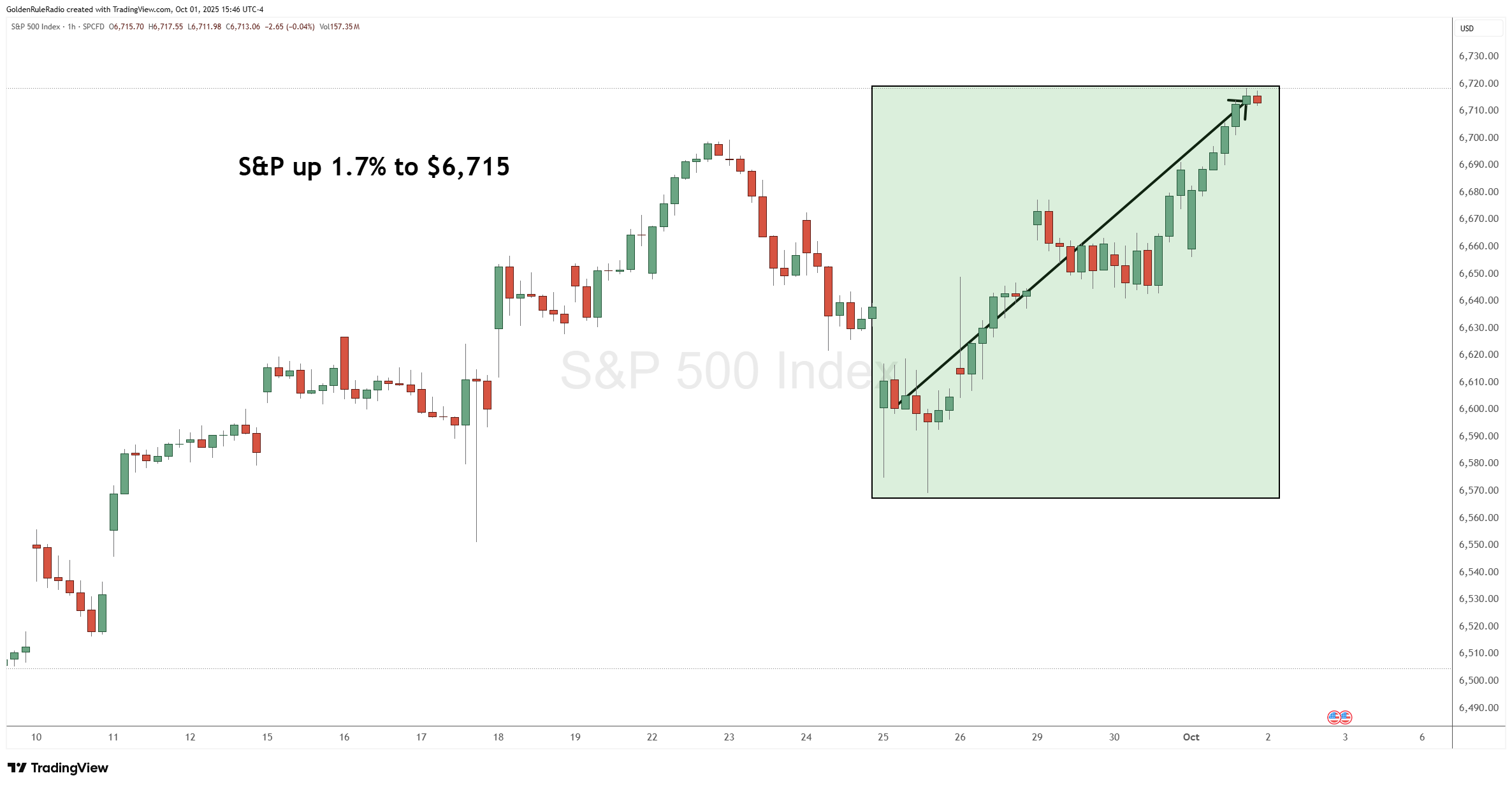 The S&P 500 is up 1.7% this week, currently sitting at 6,715.