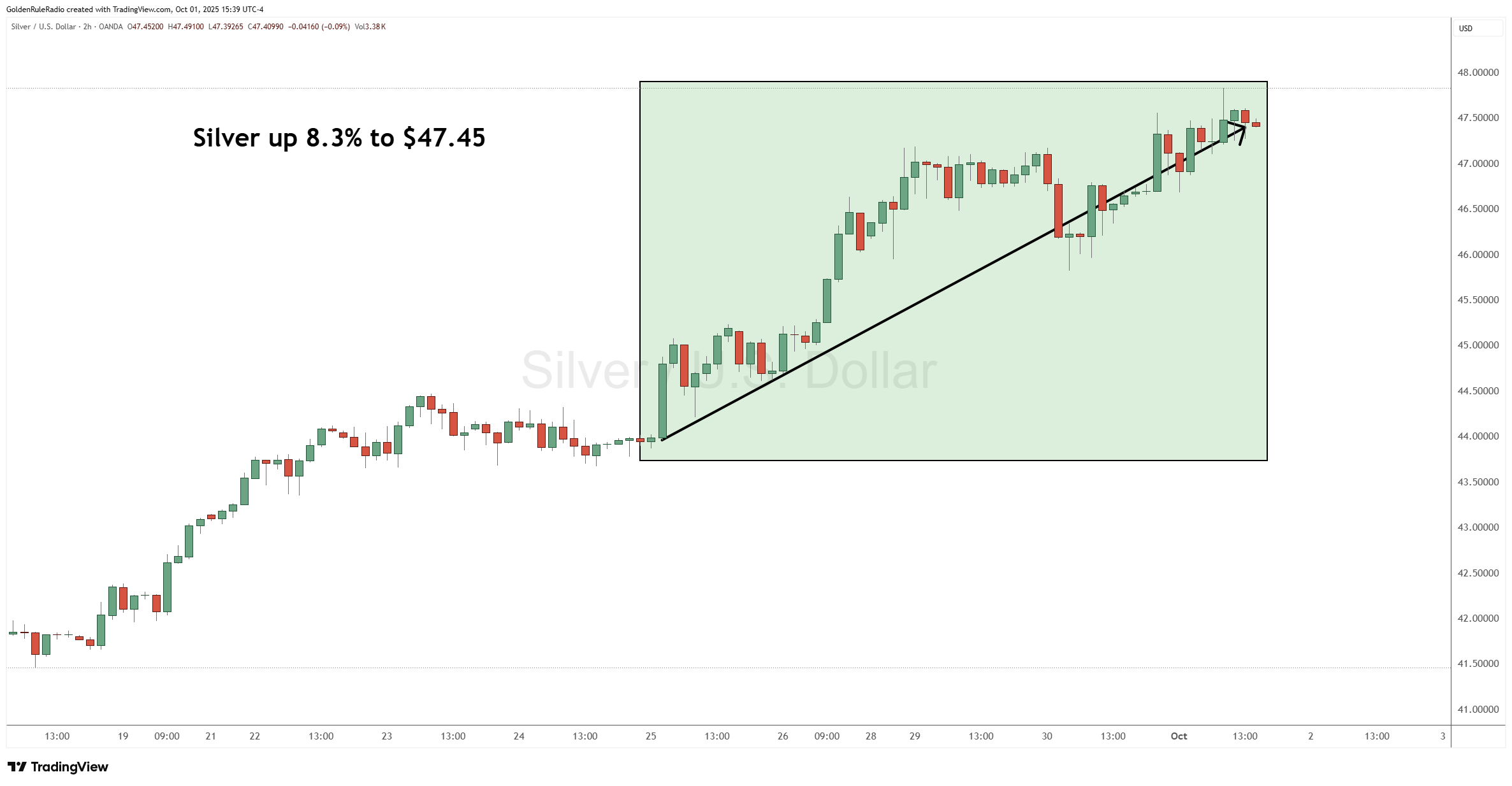 The price of silver is up 8.3%, sitting at $47.45. It’s closing in on that fabled $50 per ounce level.