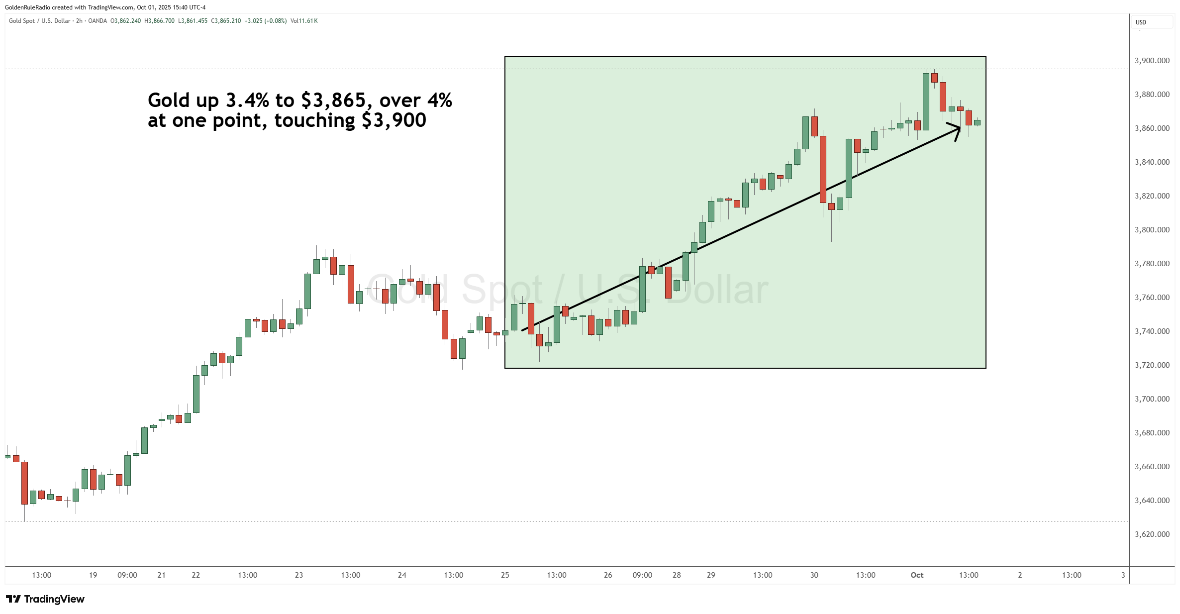 The price of gold is up 3.5% at $3,865 as of recording. Intraweek, gold did just touch that $3,900 level.