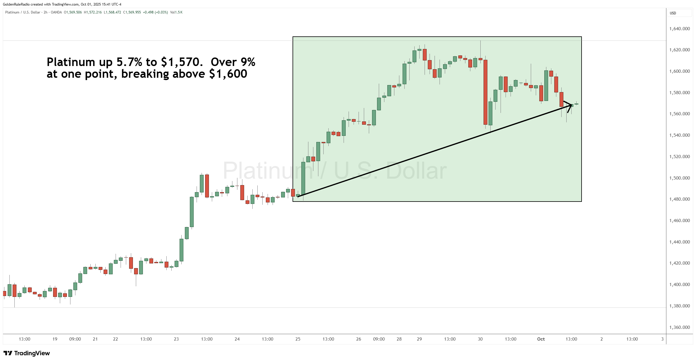 Platinum is up 5.7% sitting at $1,570. The white metal was a little bit higher in the week, up over 9% and it did break above $1,600.