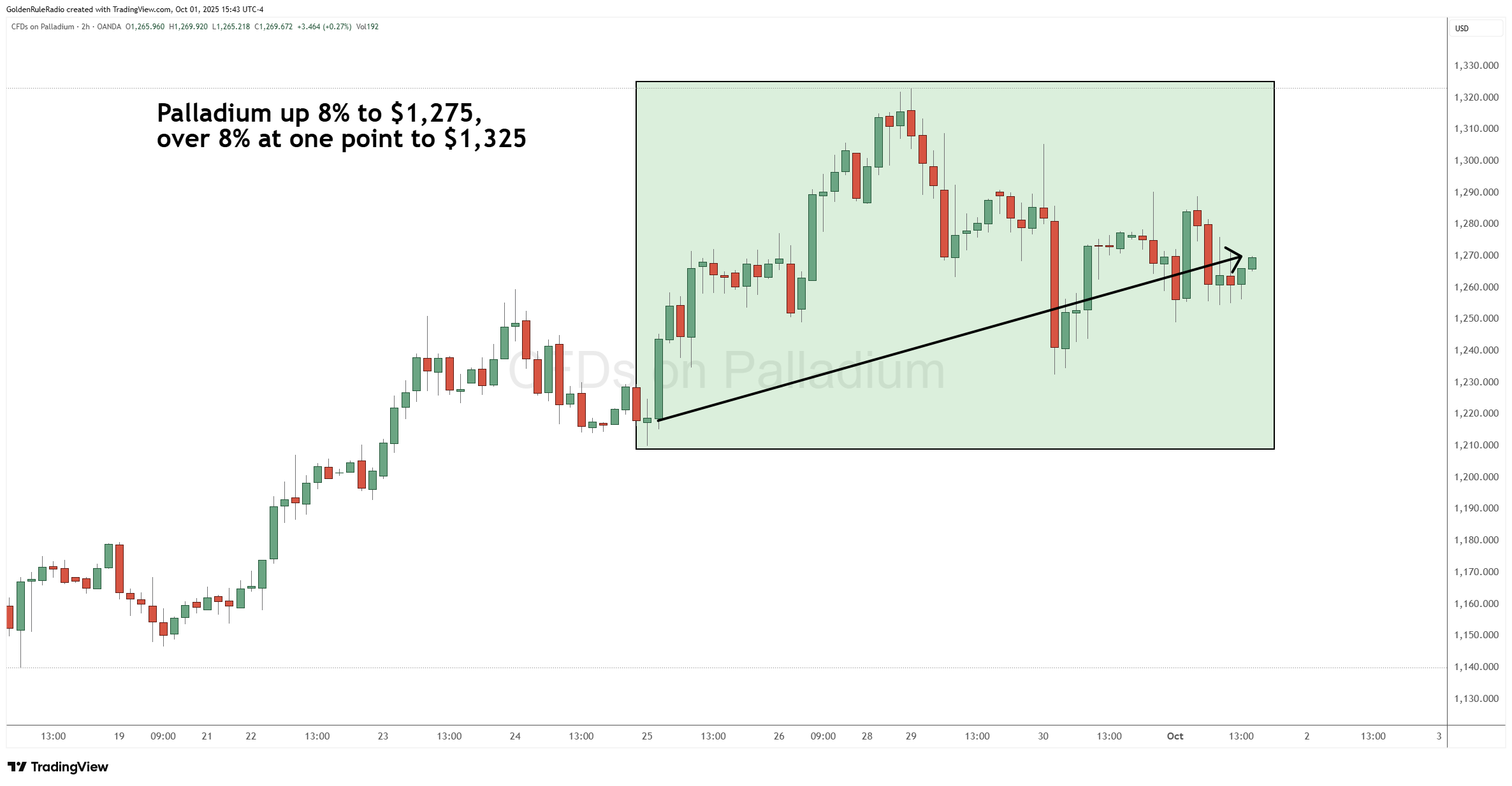 Palladium is up about 4% to $1,270. At one point, platinum’s sister metal was up over 8% as it pushed up as high as $1,325 earlier in the week.