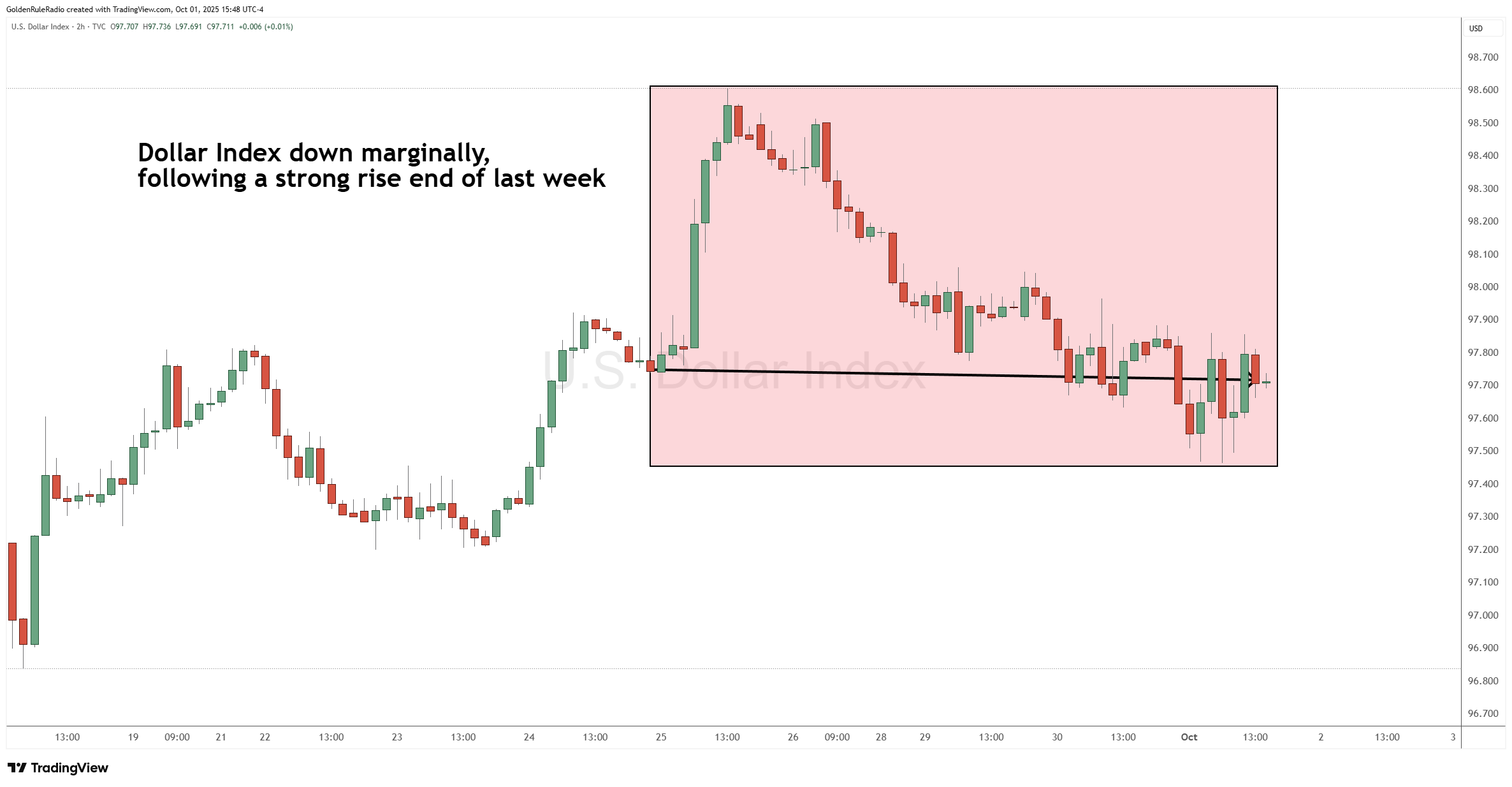The US dollar index is about flat, down just slightly from a week earlier and sitting at 97.75.