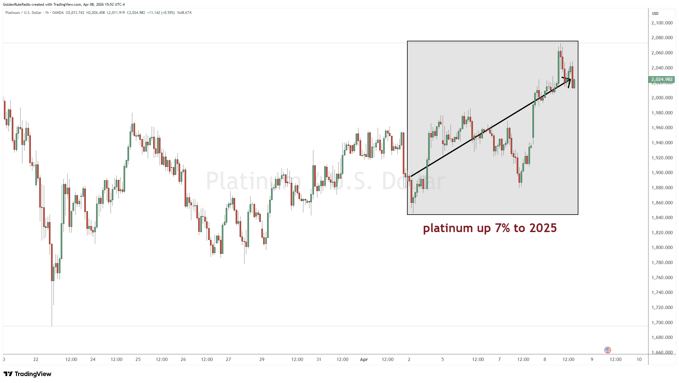 Platinum is up 7%, currently sitting at $2,025.