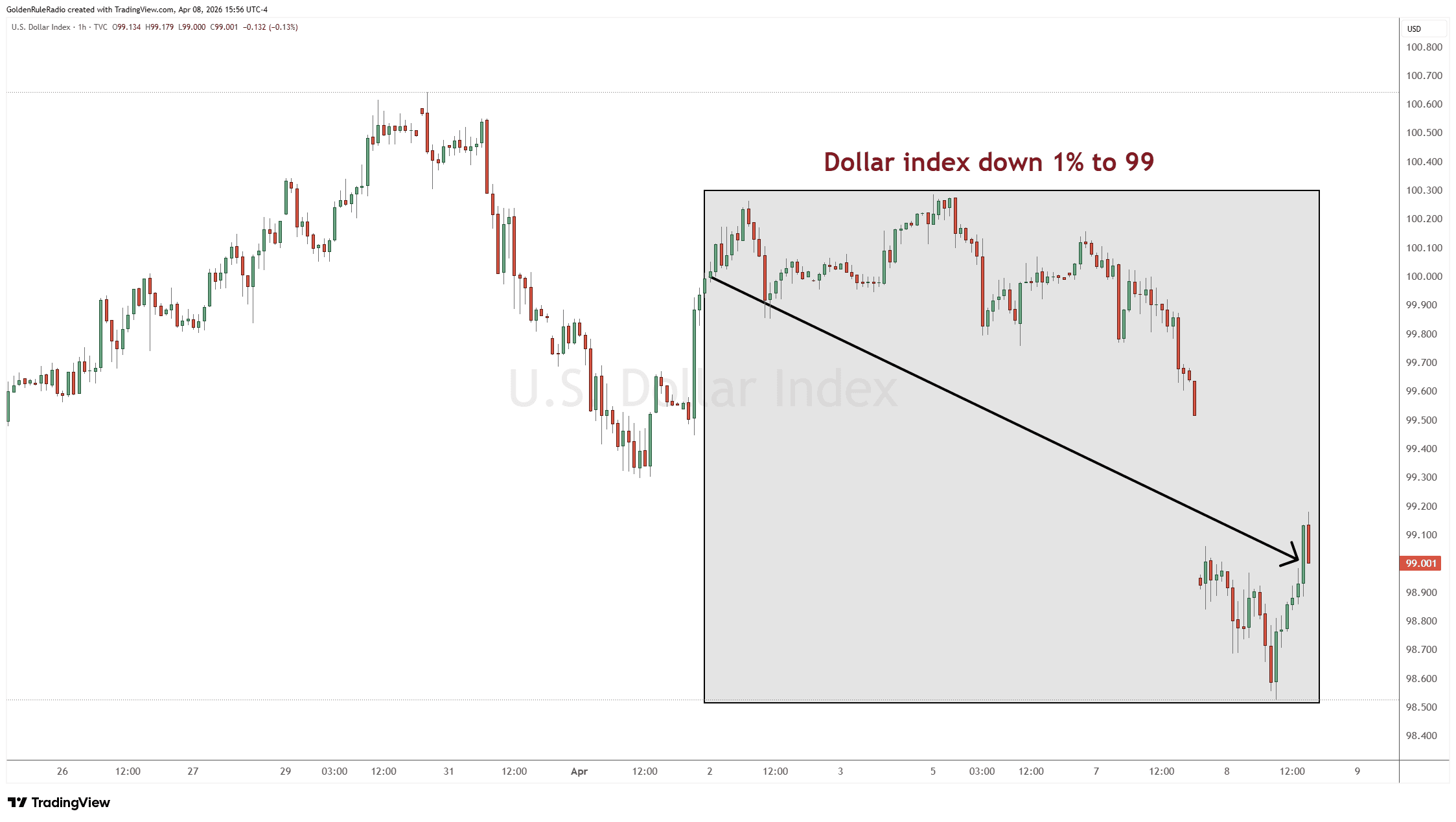 The US Dollar Index is down 1% and sitting at 99, most of which happen like in a day.