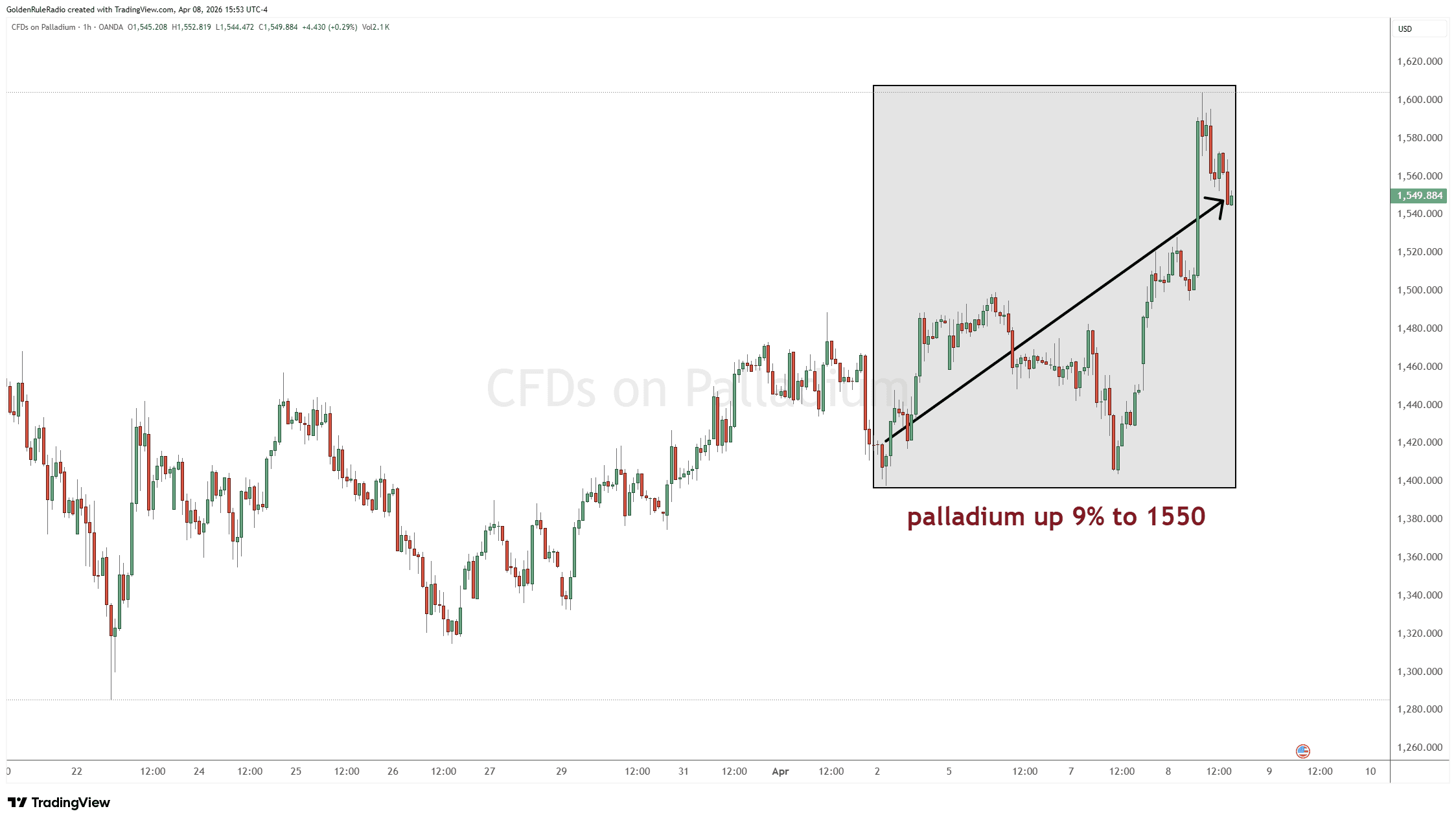 Palladium is up 9% at $1,550 as of recording.
