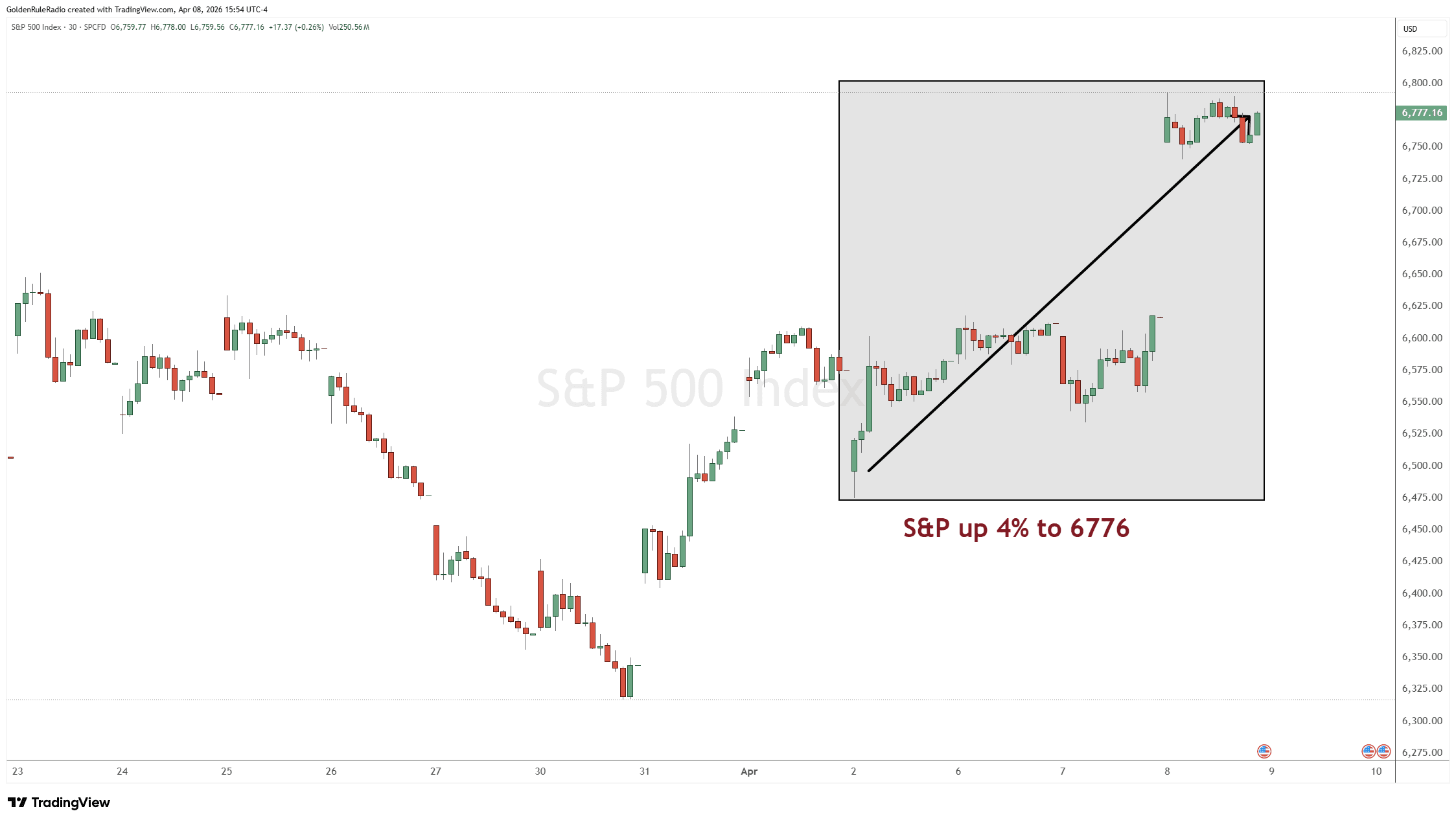 The S&P 500 is up 4%, sitting at 6,776 points.