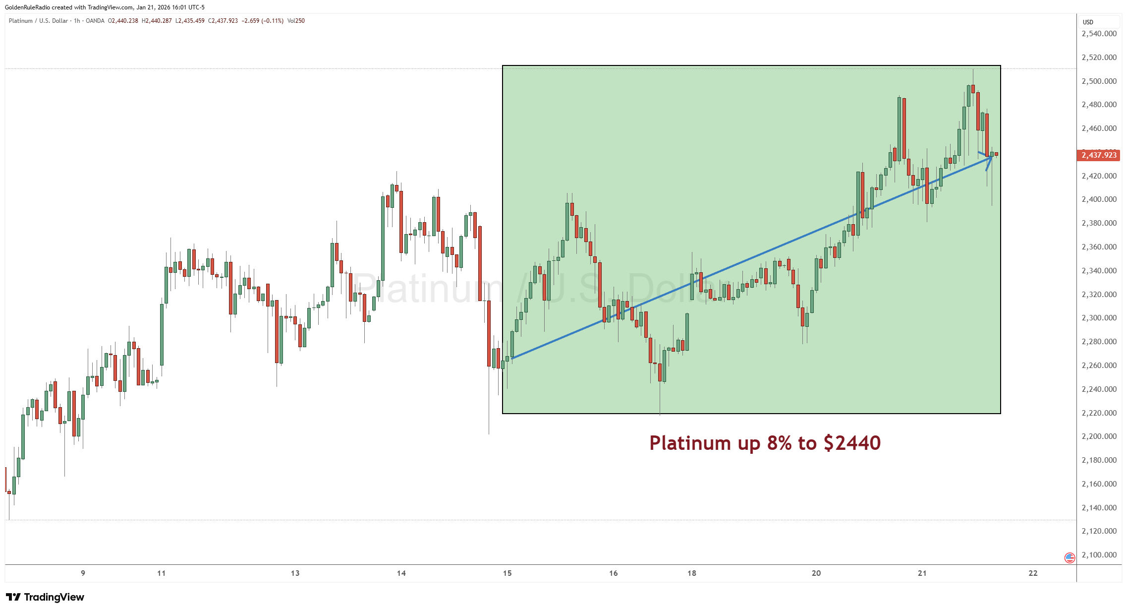 Platinum is up 8%, sitting at $2,440. It is the big winner this week, but still below some of the previous highs.