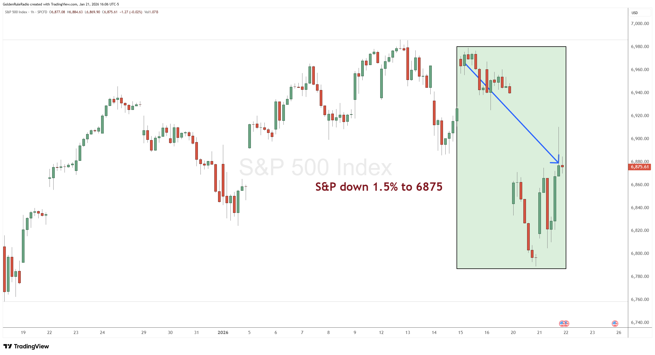 The S&P is down about 1.5% at the moment, sitting at 6,875. Most of that decline happened in the last day or so. It was down a little over 2%.