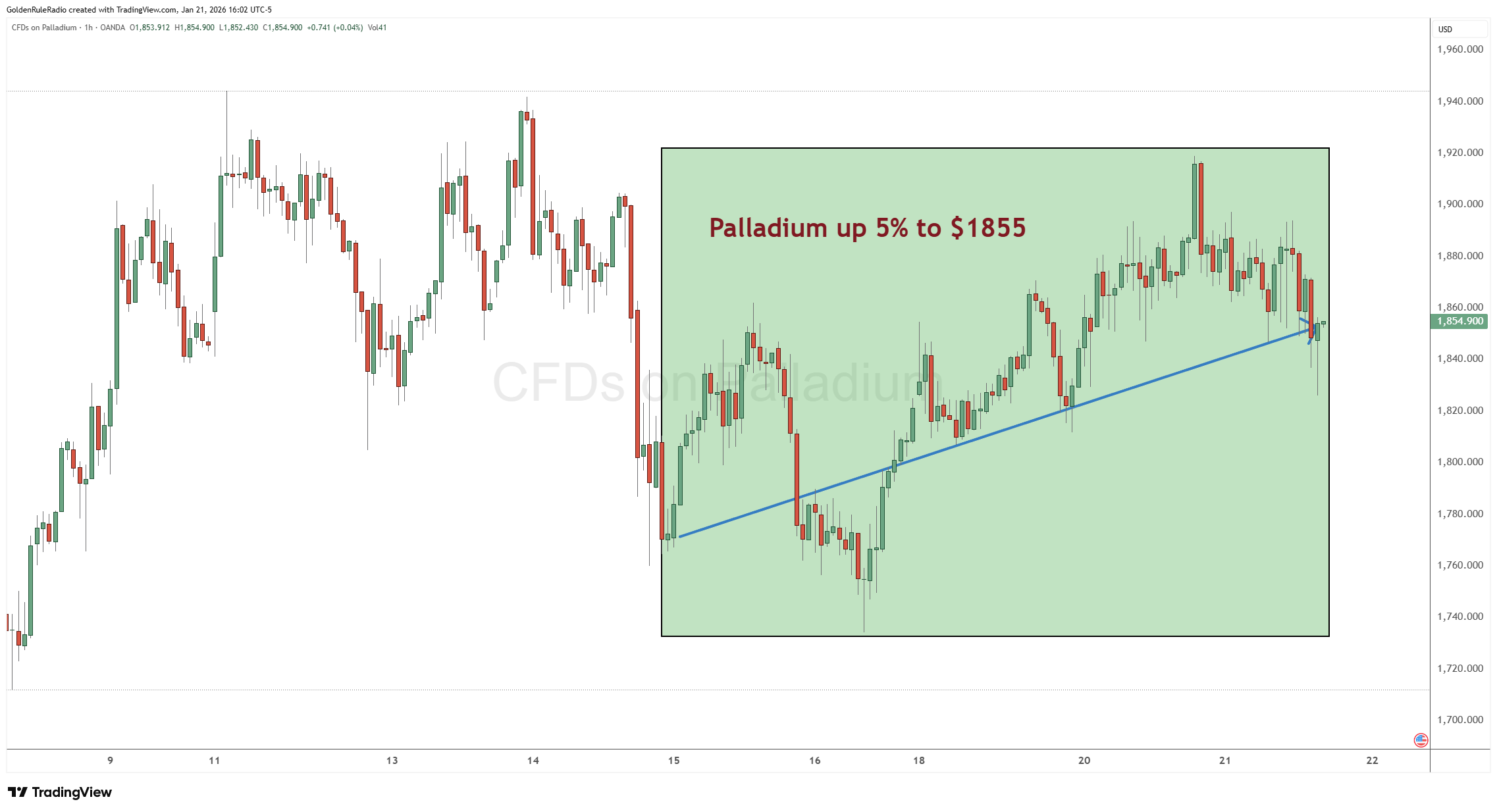 Palladium is up 5% at $1,855. Platinum is now about 30 some percent above its sister metal palladium.