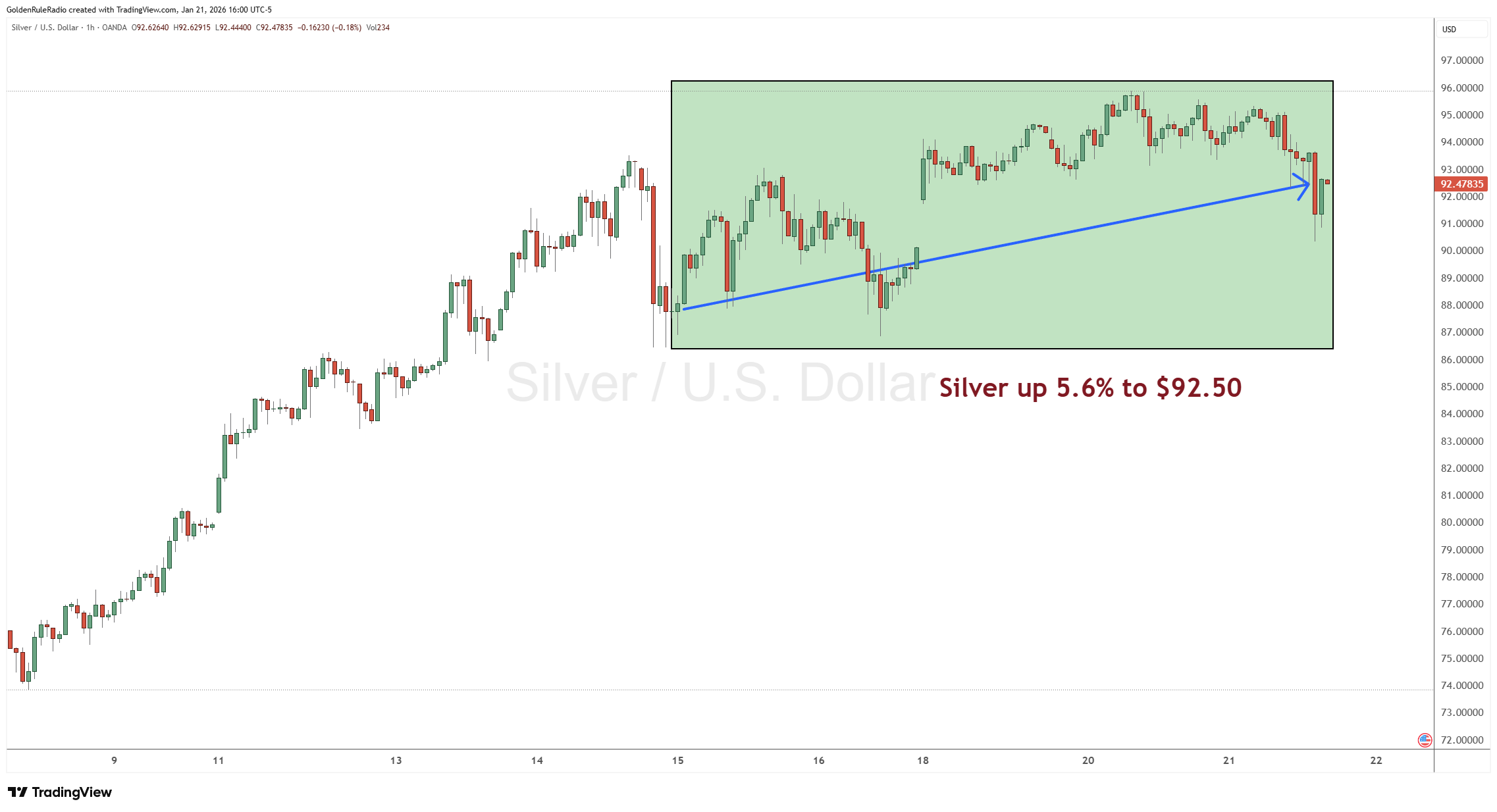 The price of silver is up about 5.6%, currently at $92.50. The white metal may have gone up about 12% at one point, closing at $94.95 the previous day.