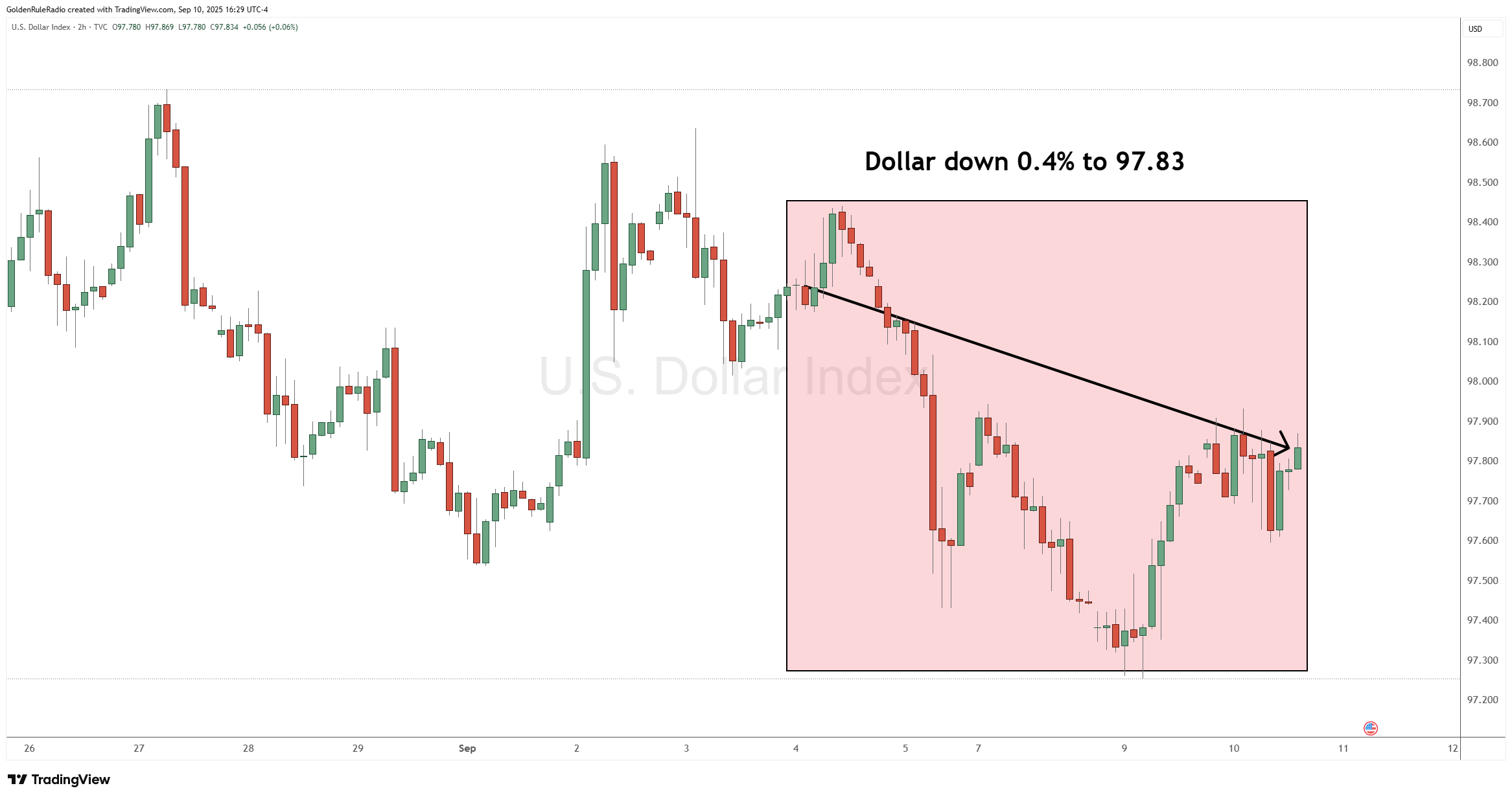 A critical driver behind gold’s strength is the weakening US dollar, which has continued to erode in value and now sits at 97.83, down half a percent in just the past week. This is not simply a technical move, but rather a reflection of persistent monetary debasement and growing investor skepticism over the true state of the jobs market and inflation data.