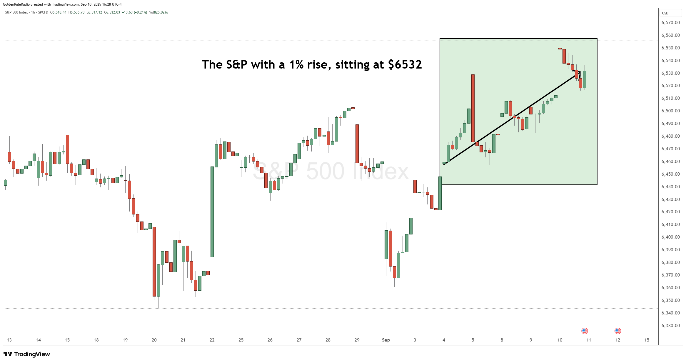 The S&P 500 is up 1%, currently at 6,532, putting in another all-time high like gold did.