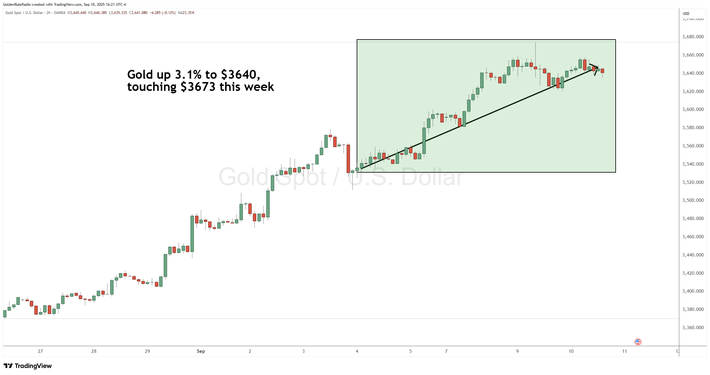 The price of gold is up 3.1%, sitting at $3,640 as of last week’s recording. Gold reached as high as $3,673 at one point, continuing its run up to the next level.