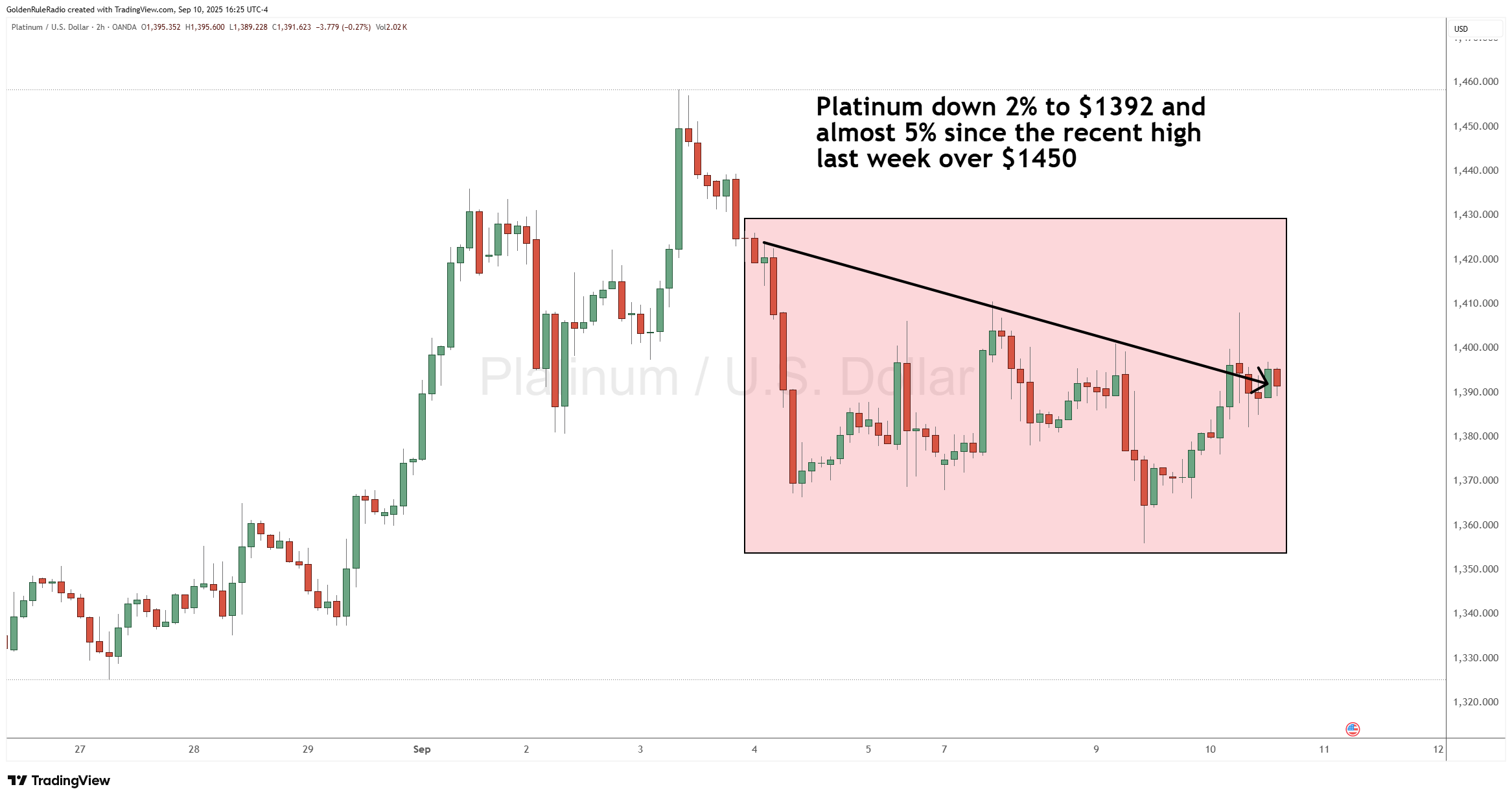 Platinum is down about 2%, currently sitting at $1,392, just under the $1400 level and almost 5% down from the recent high it put in last week.