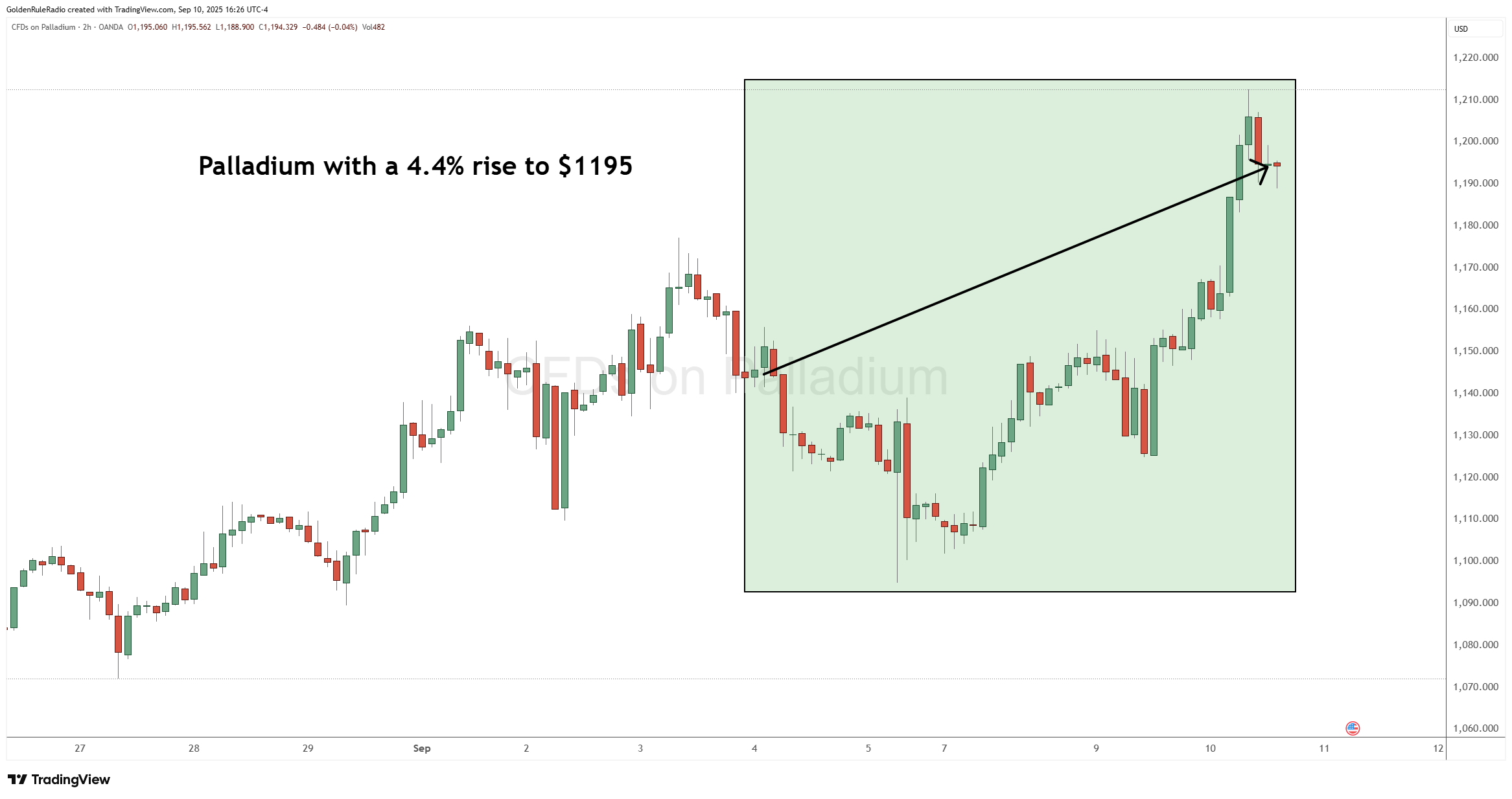 Palladium is up about 4.5%, sitting at $1,195 from a week earlier. It is squeezing the platinum to palladium ratio down just a bit.