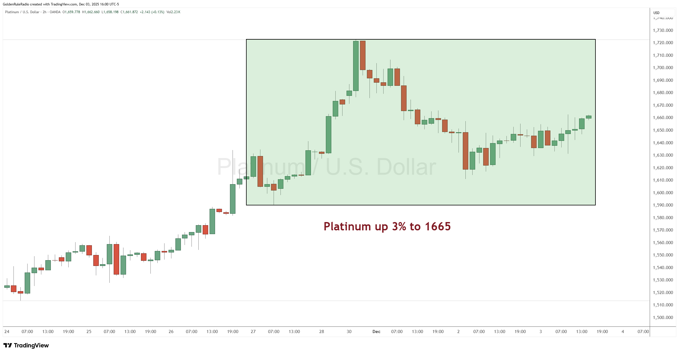 Since Thanksgiving, gold has pushed to roughly 4,200 per ounce while silver has jumped to about 58.5, giving silver a weekly move nearly seven times larger than gold in percentage terms. That has driven the gold‑to‑silver ratio down from extreme levels above 100 earlier this year to roughly 72 today, a clear sign that silver is finally outperforming gold after years of lagging.