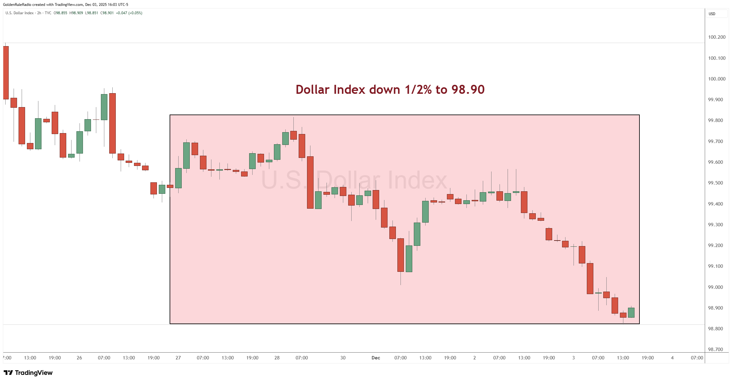 The US Dollar Index is down about 0.5%, sitting at 98.8.