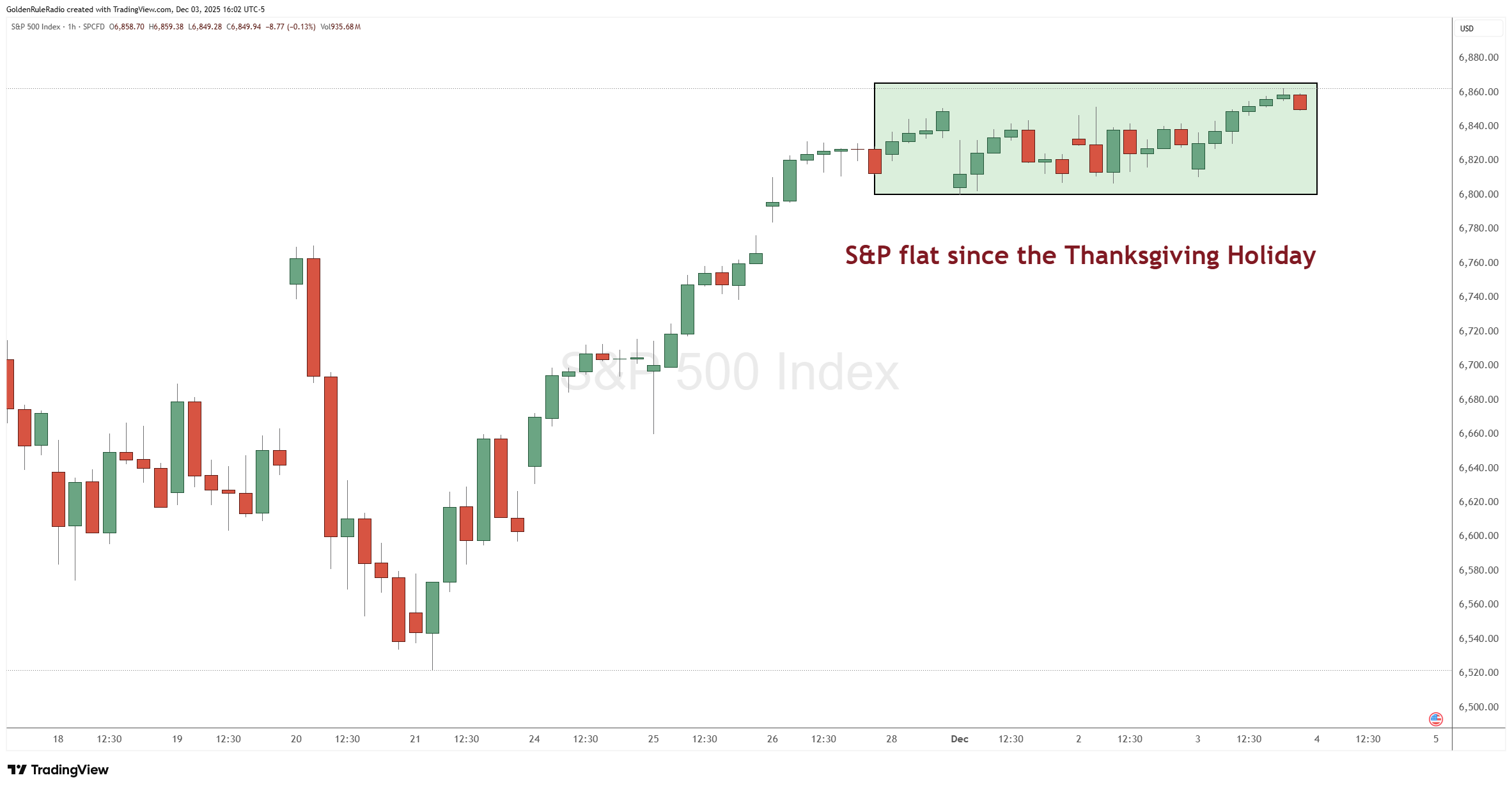 The S&P 500 is about flat week over week at 6,840. It had a nice run up just before Thanksgiving.