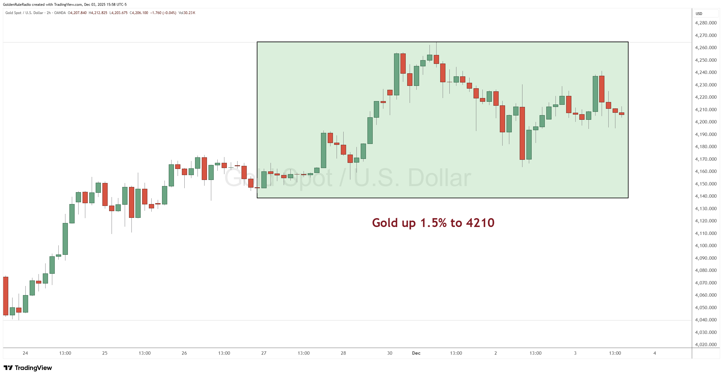 The price of gold is up about 1.5%, currently sitting at $4,210.