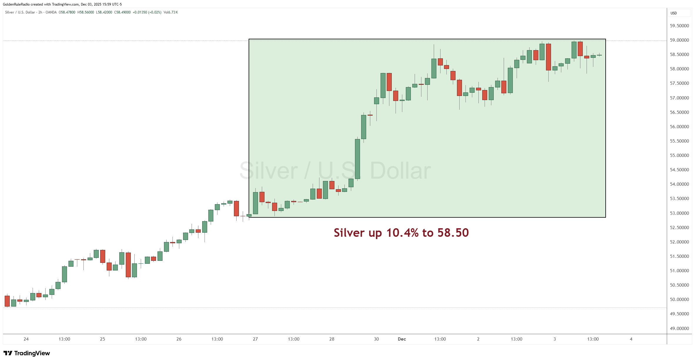 The price of silver is up a whopping 10.5%, sitting at $58.50 as of recording.