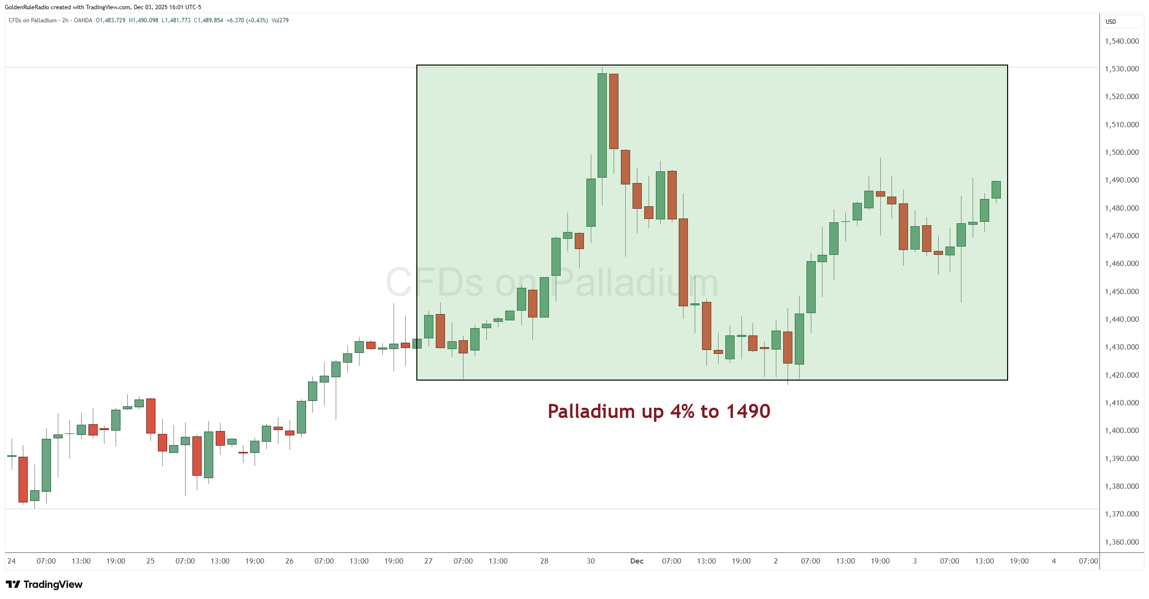 Palladium is up about 4% to just around $1,490. It is now lagging just a little behind its sister metal.