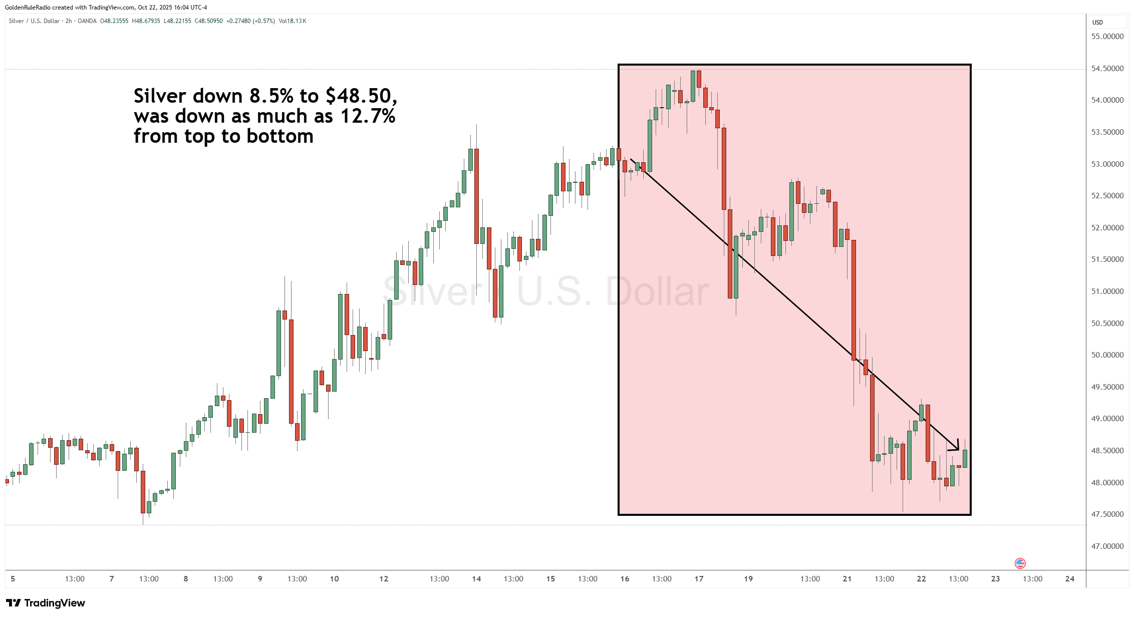 The price of silver is down 8.5% sitting at $48.50. Over the whole week, silver had a bigger swing of as much as almost 13% from high to low.