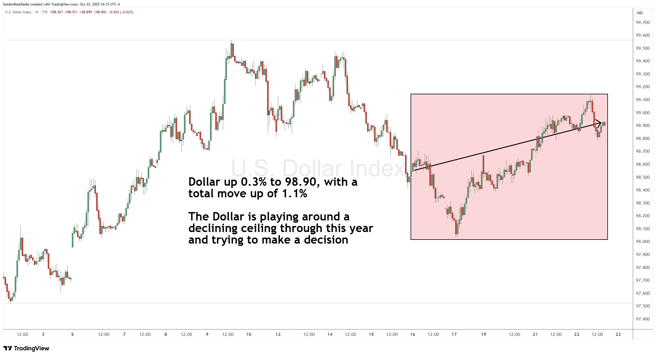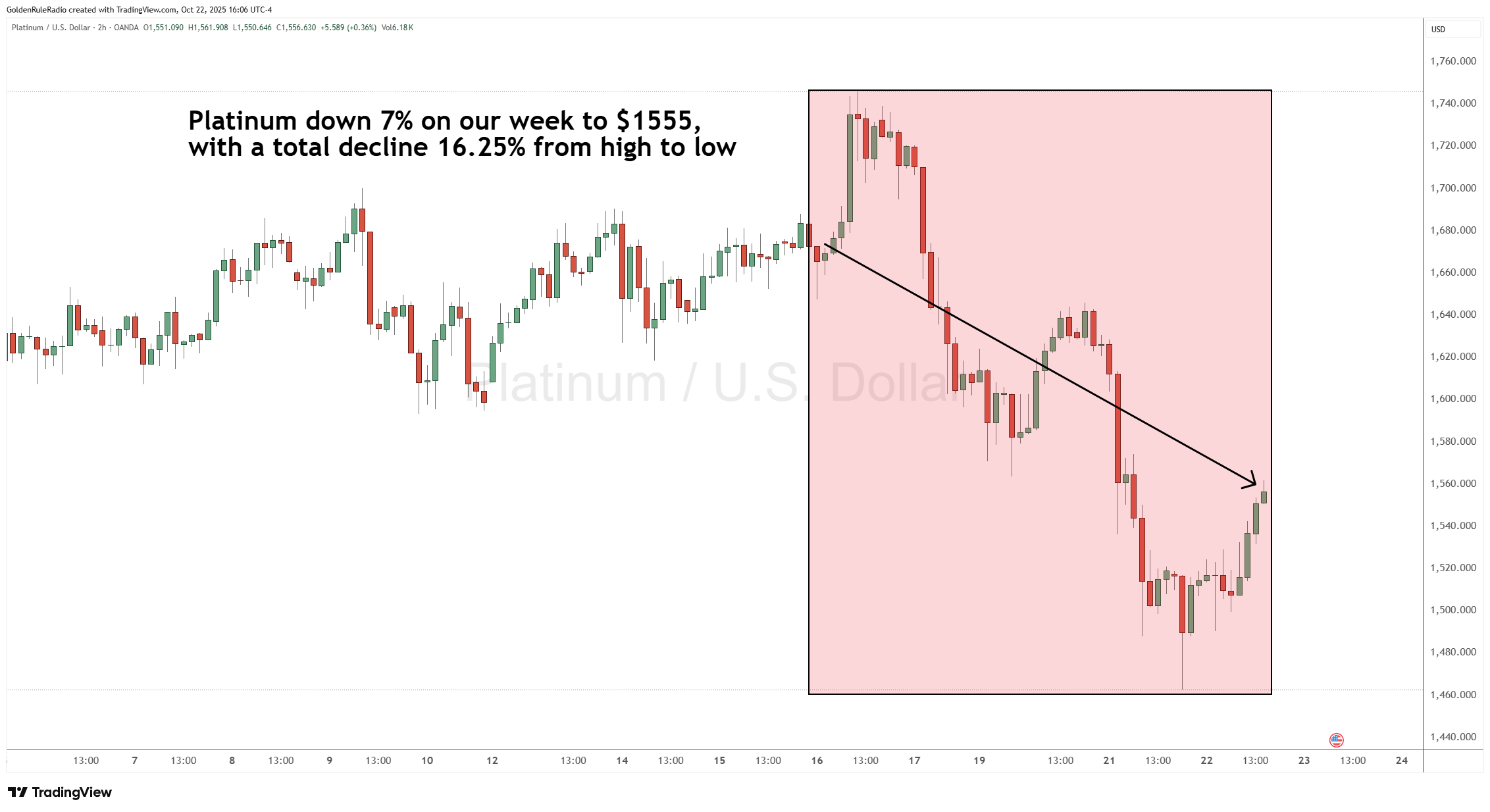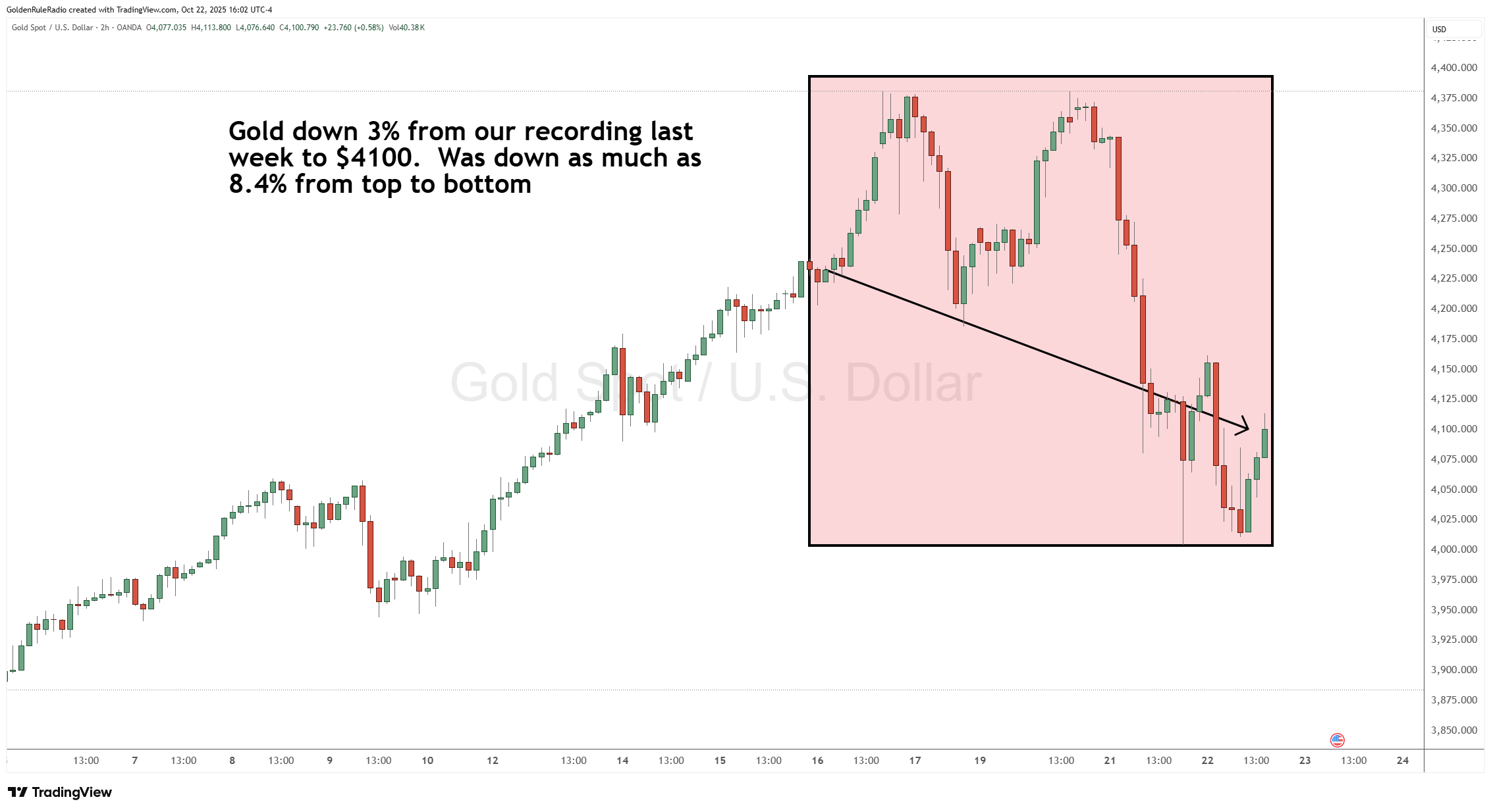 The price of gold is down 3% to $4,100 since our recording the prior week. From high to low, gold had about an 8.5% move intraweek.