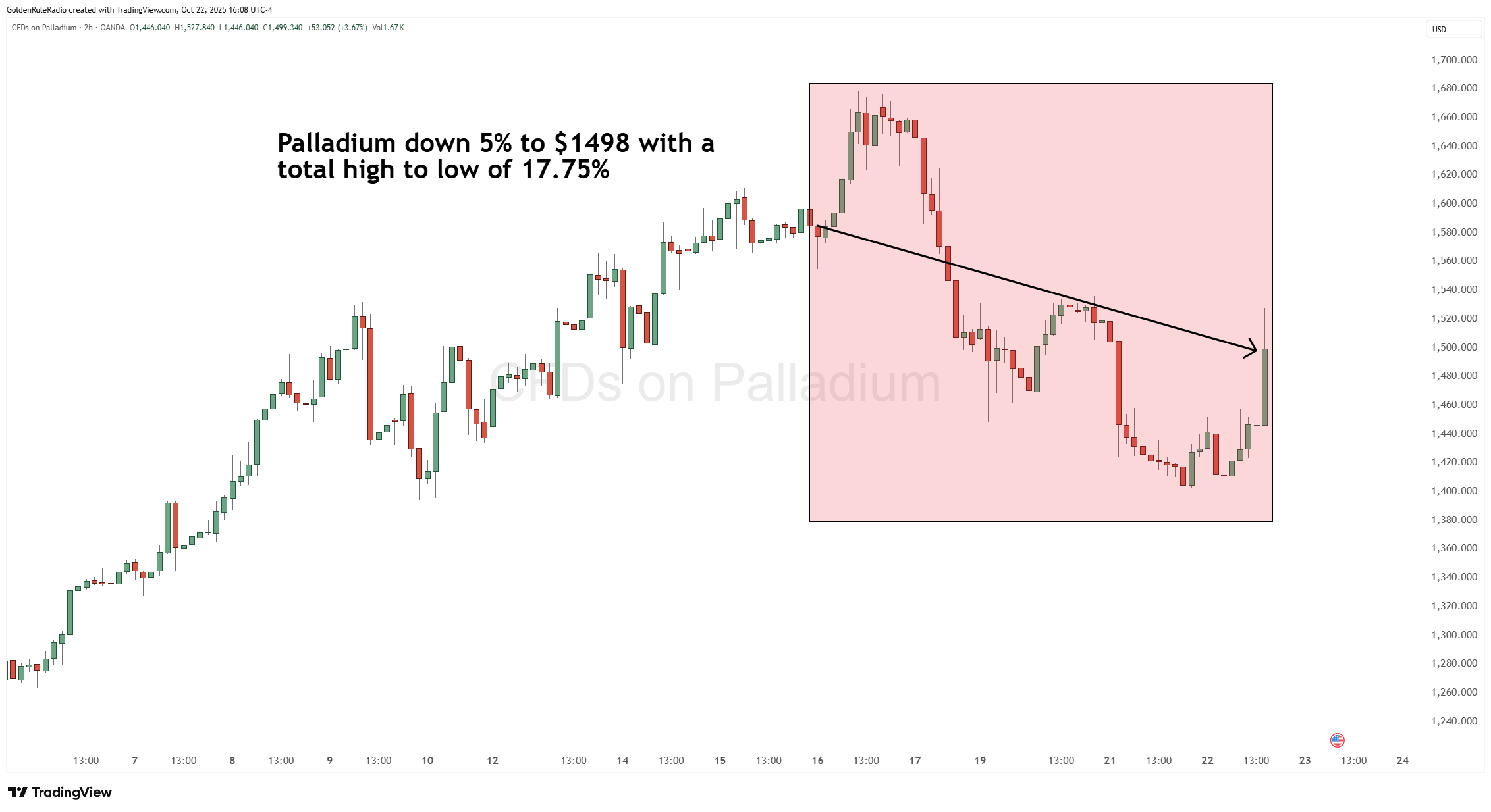Palladium is down 5% sitting at $1,500 over the last week. It also had a wild swing intraweek of about 18% from top to bottom.