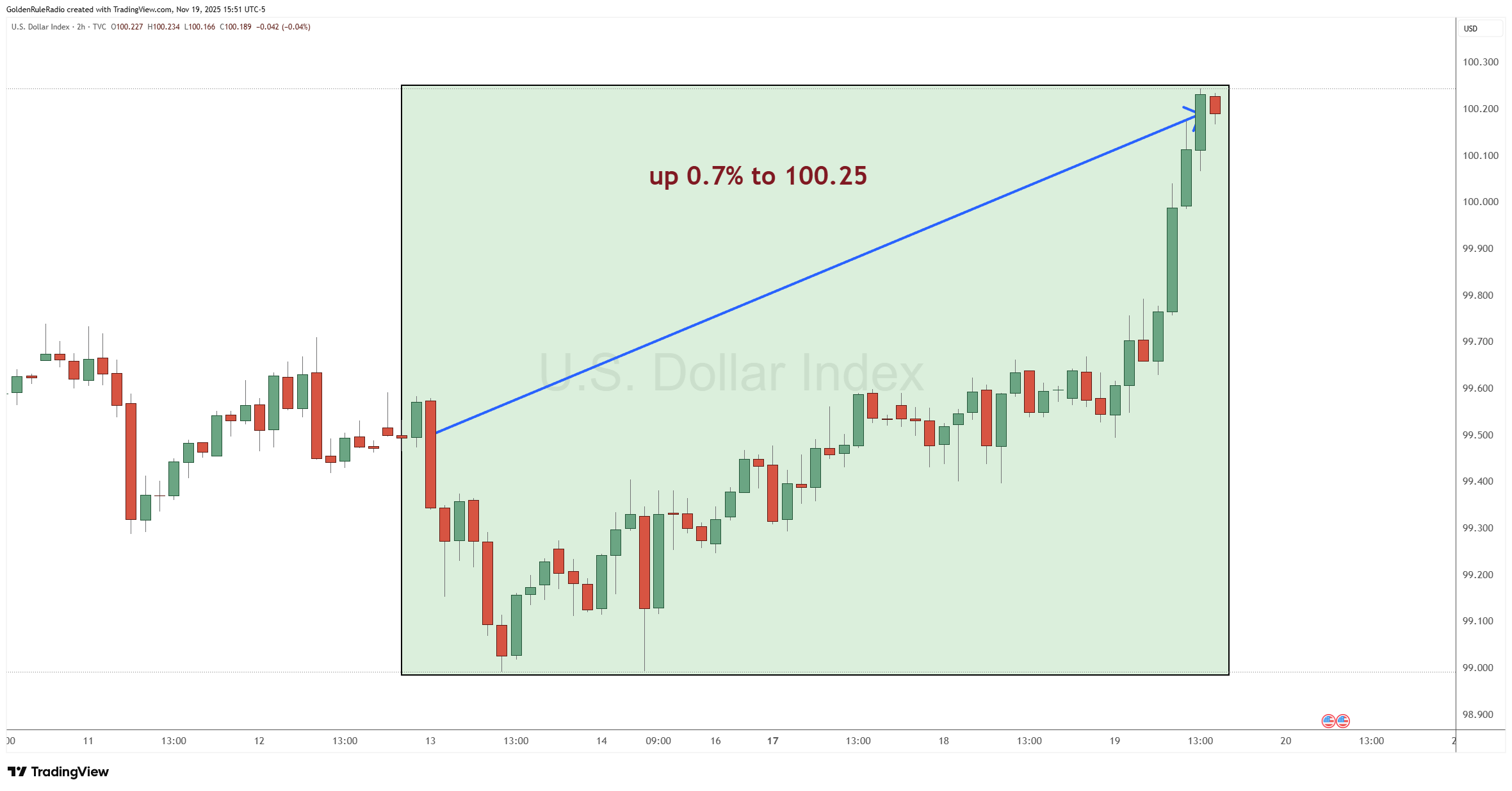 The US Dollar Index is up about 0.5%, sitting at 100.25, an expected move with precious metals prices declining.