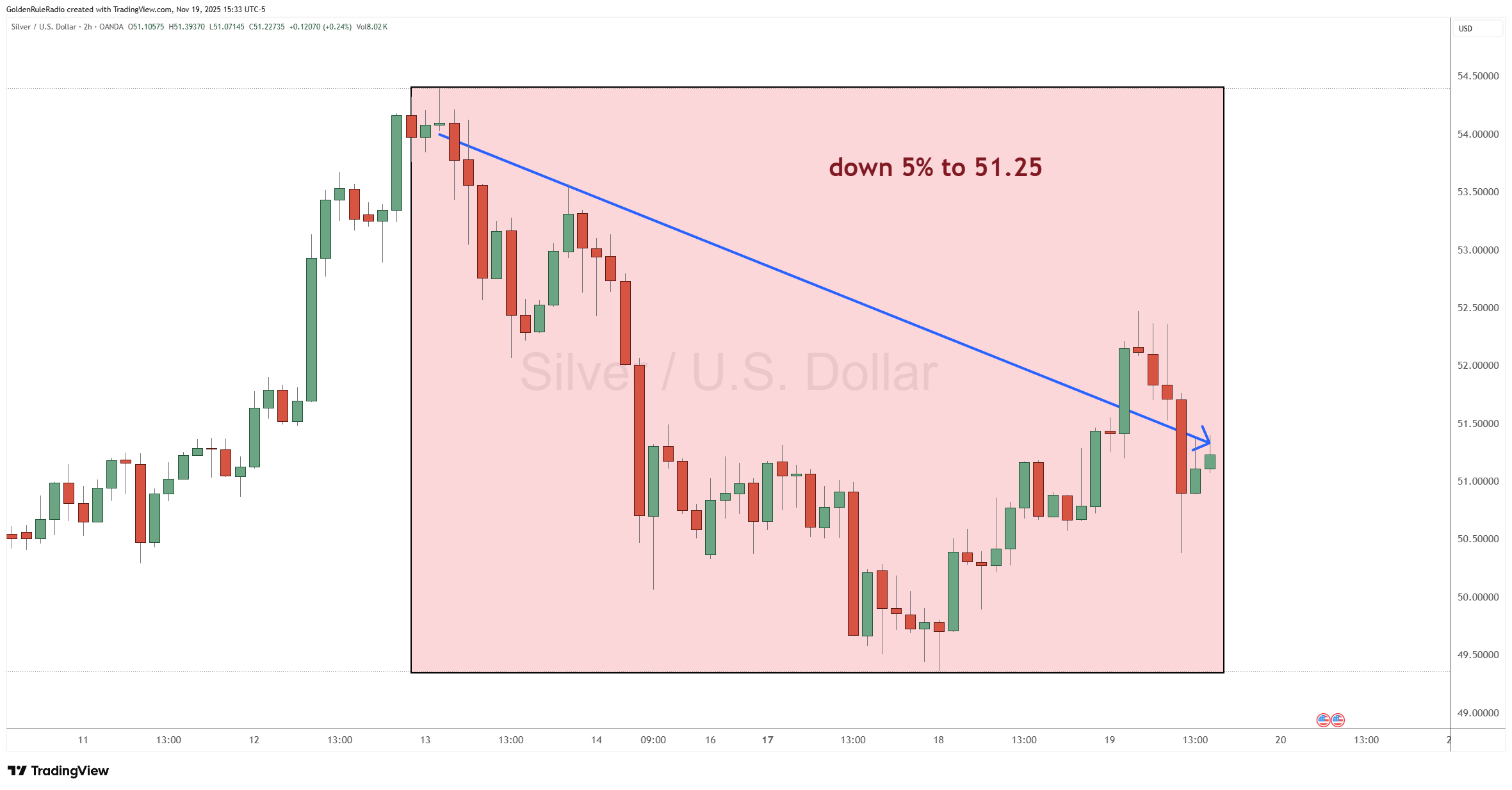 The price of silver is down about 5%, sitting at $51.25 as of recording.
