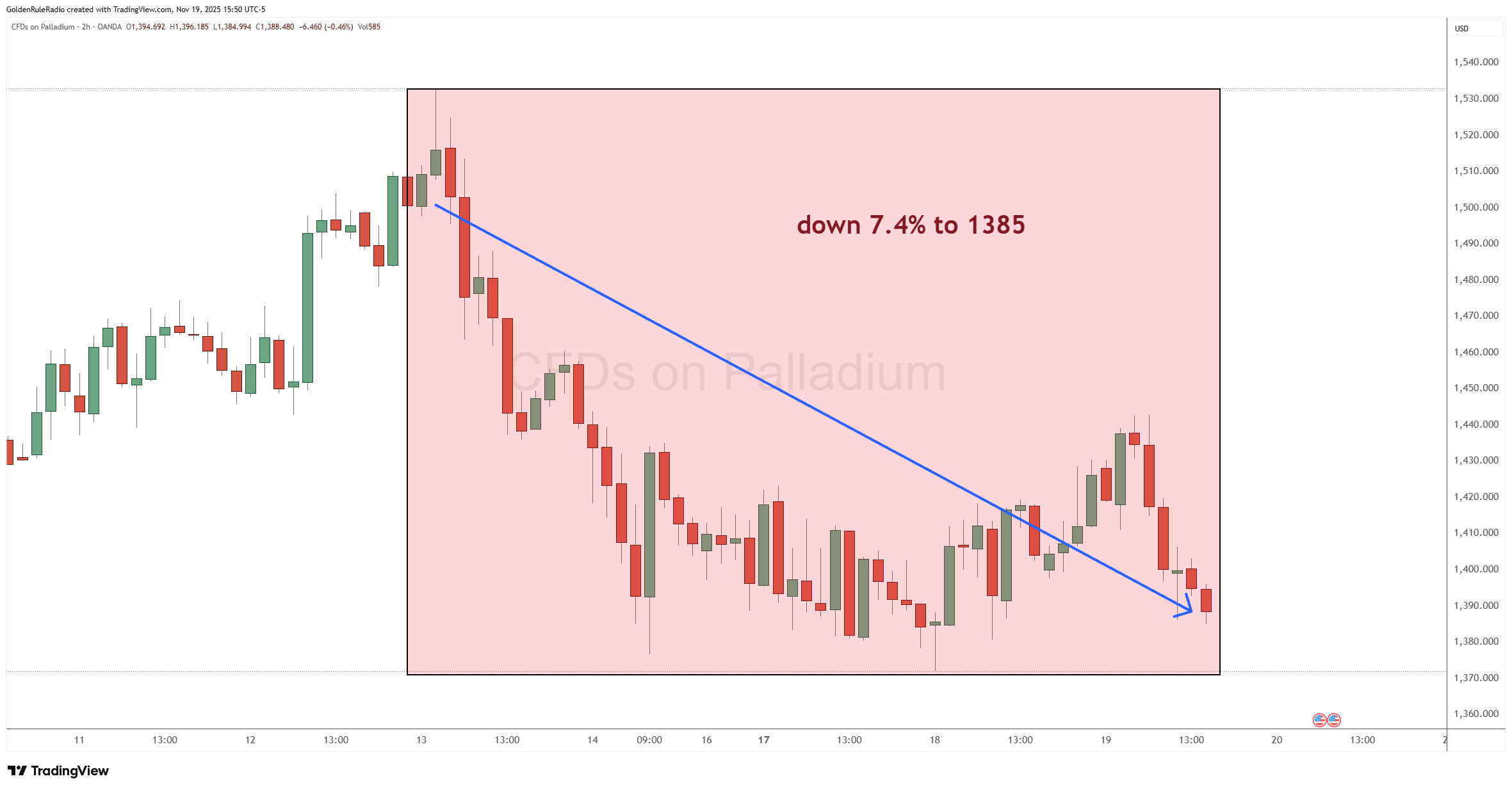 Palladium is down 4.5% to just around $1,385. It is now about $150 behind its sister metal, platinum.