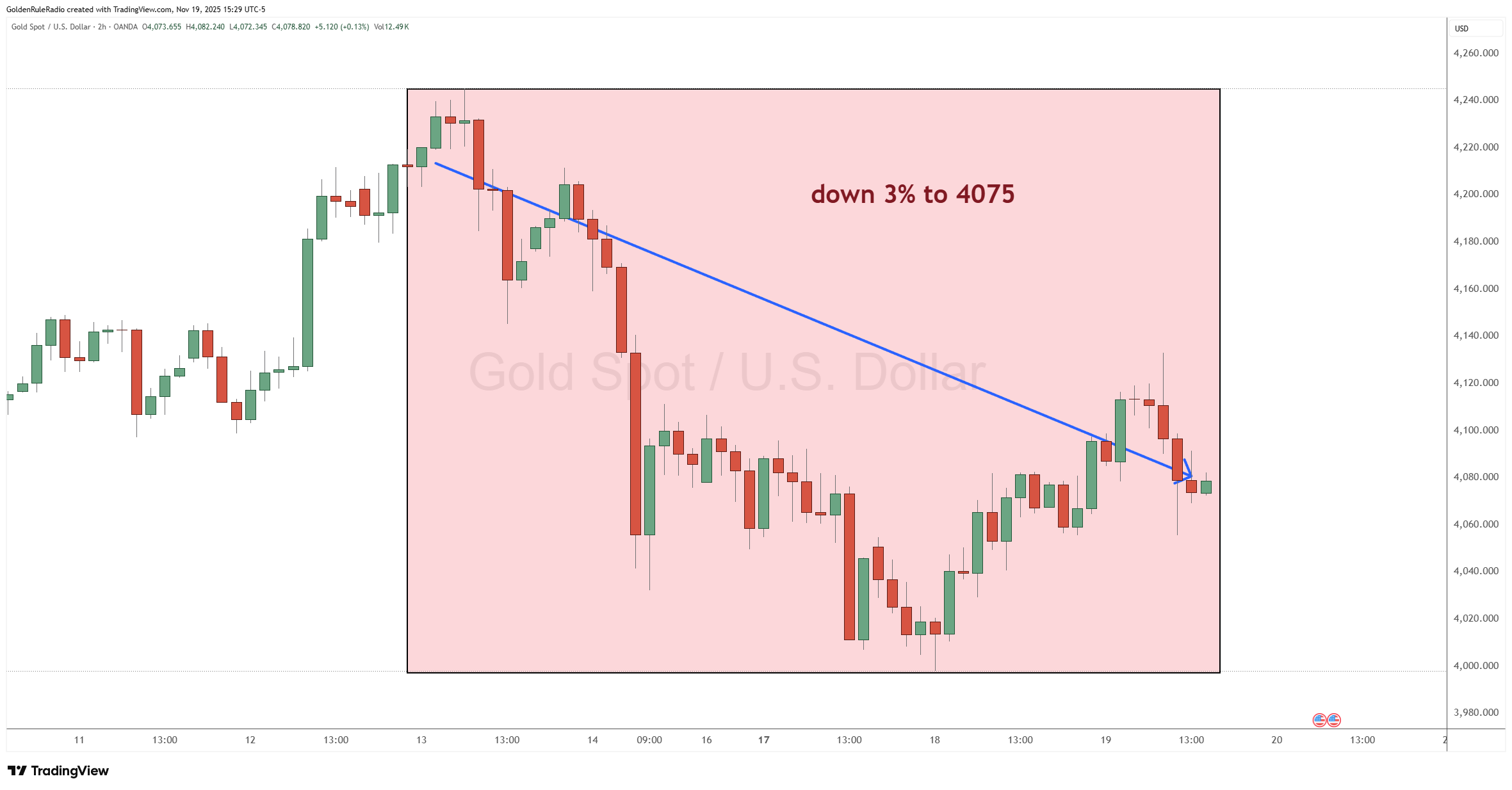 Over the past several weeks, gold has retraced about 3% from its recent highs, currently trading just under $4,075 per ounce. Silver and other precious metals like platinum and palladium have followed a similar trend, with silver down about 5% and platinum roughly 5.5% lower in the same period.