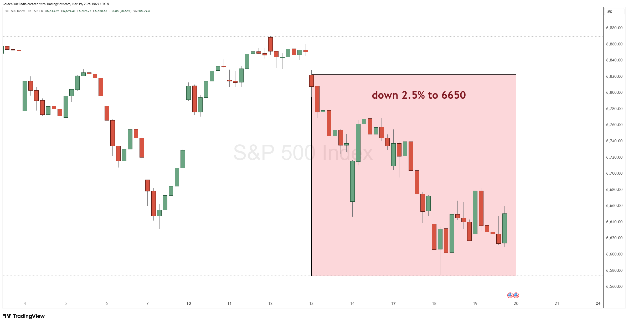 The S&P 500 is down about 2.5% to 6,650, coming off recent high levels.