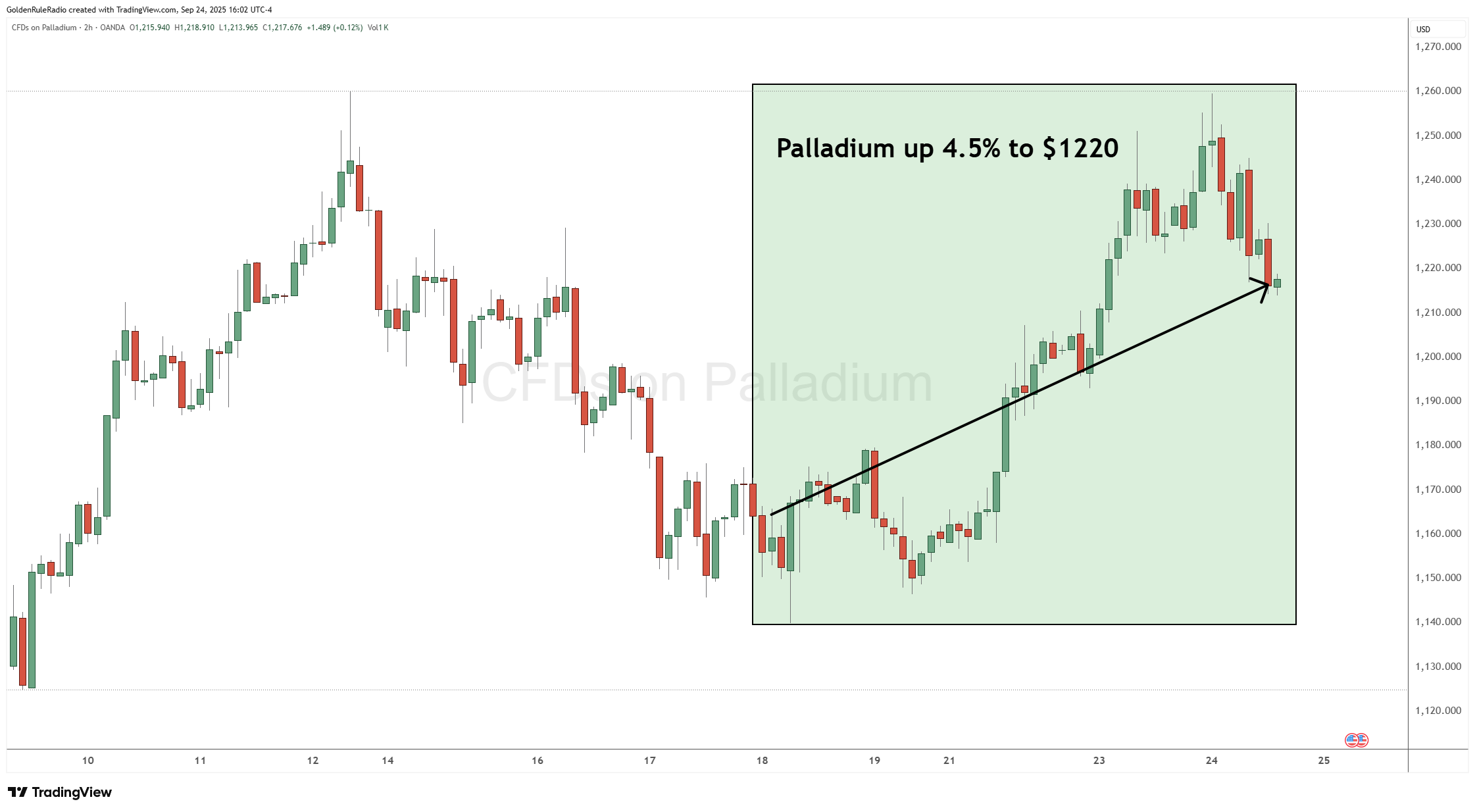 Palladium is up 4.5% to $1,220. For the time being, it seems to be tracking along with its sister metal platinum.