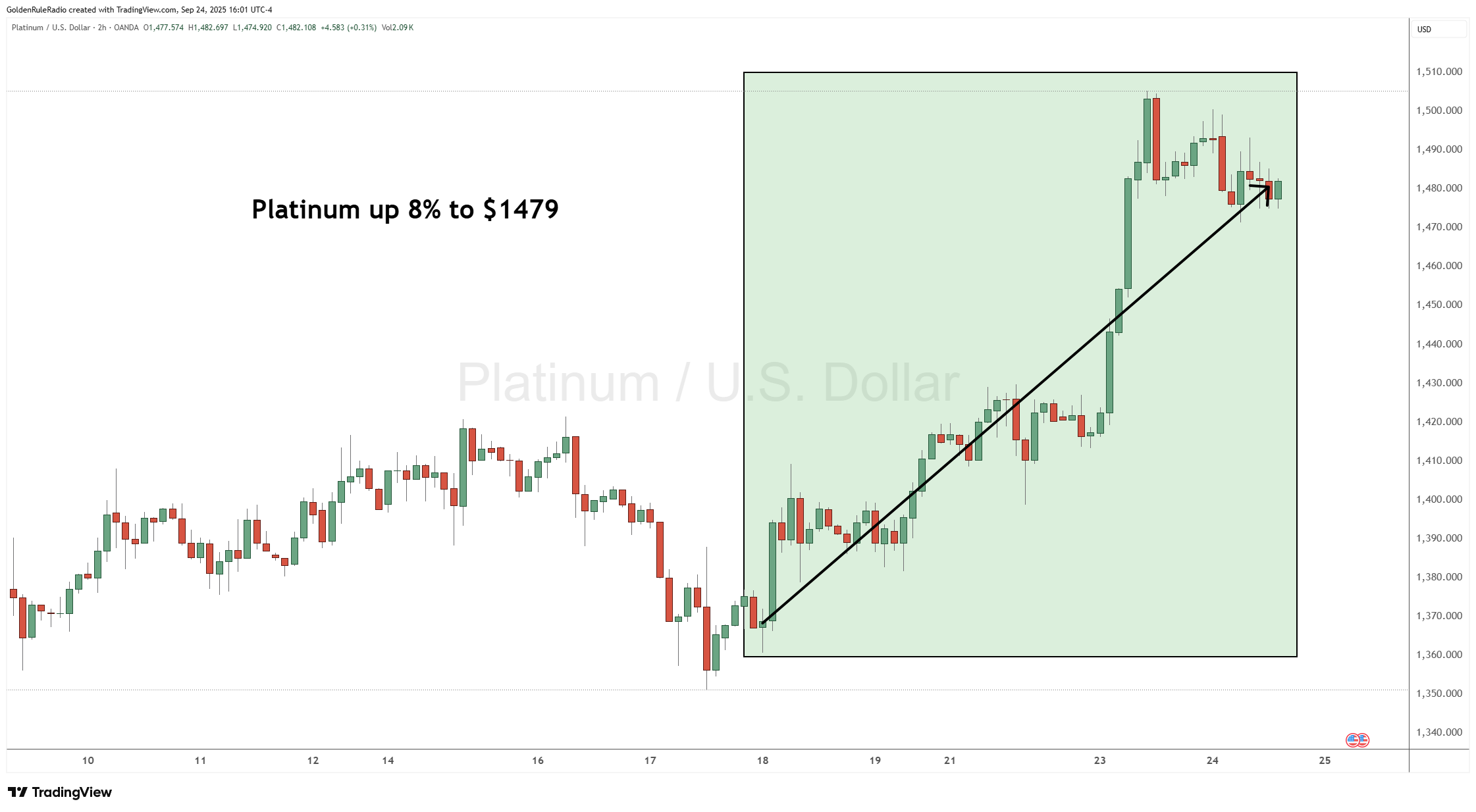 Platinum is up 8% sitting at $1,479. The white metal did break above $1,500 at one point during the week.