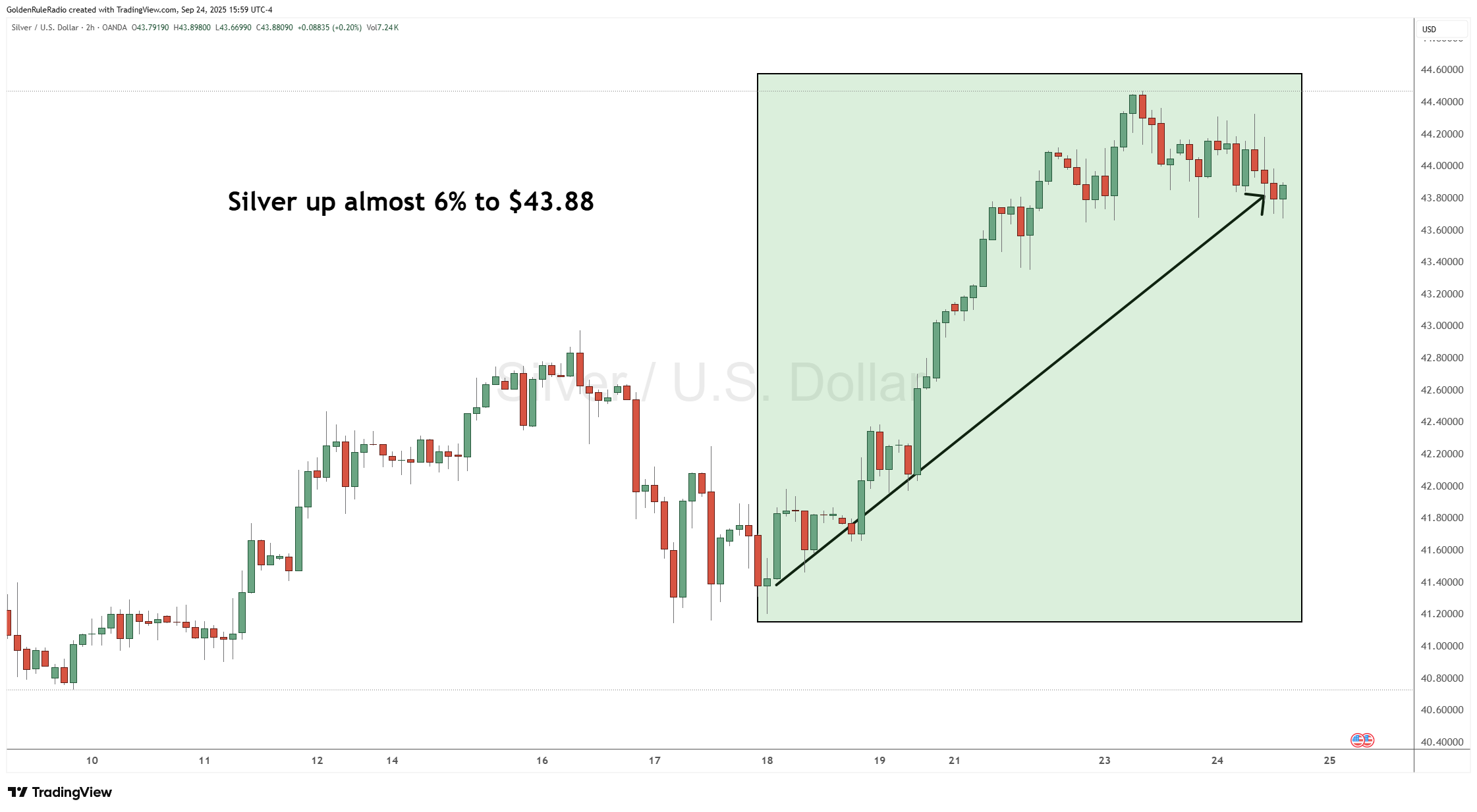 The price of silver is up 6% at $41.66. At one point during the week, silver was up almost 8%.