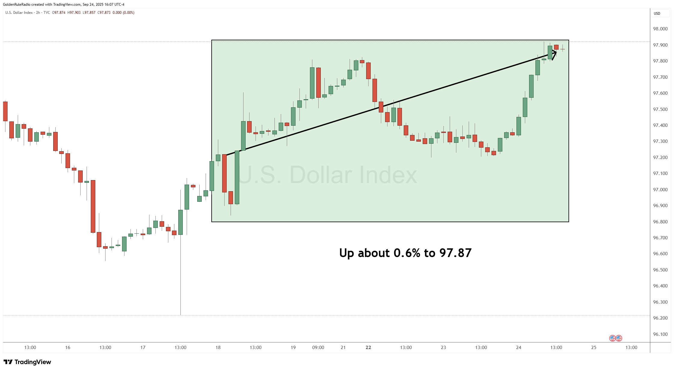 The US dollar index is up 0.5% currently sitting at 97.87. After the Fed announcement last week, the dollar had a sharp downward spike, and now it’s bouncing back up.