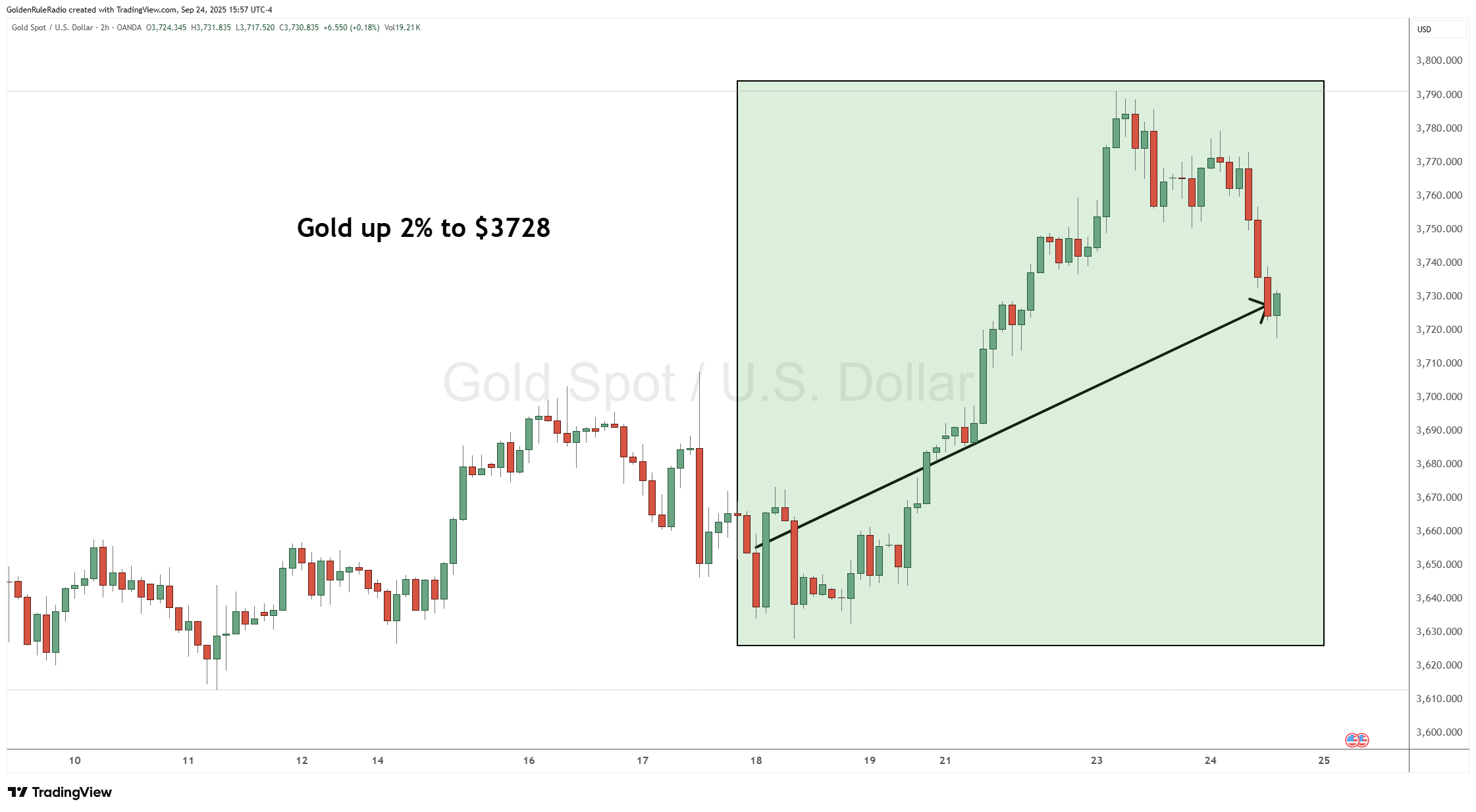 The price of gold is up 2%, sitting at $3,728 as of recording. On Monday, gold did reach as high as $3,825.