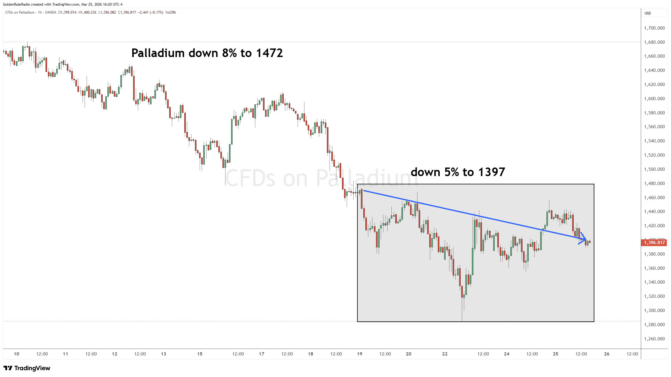 Palladium is down 5%, sitting at $1,397.