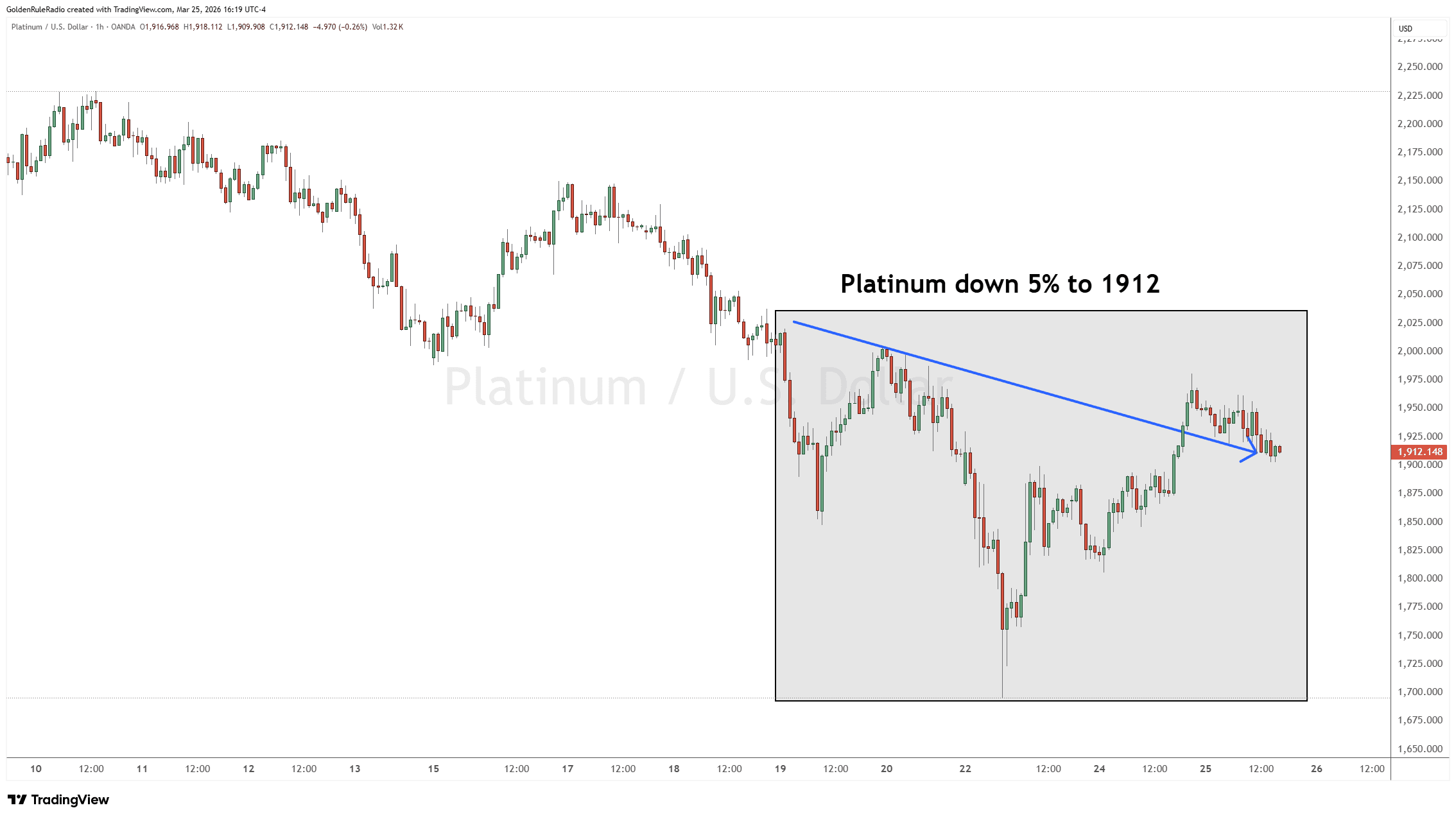 Platinum is down 5% sitting at $1,912.