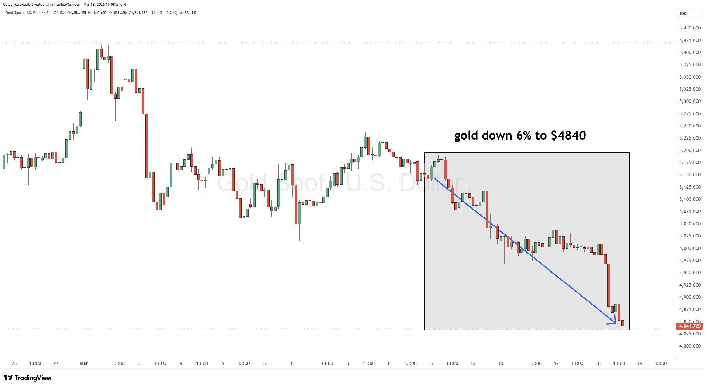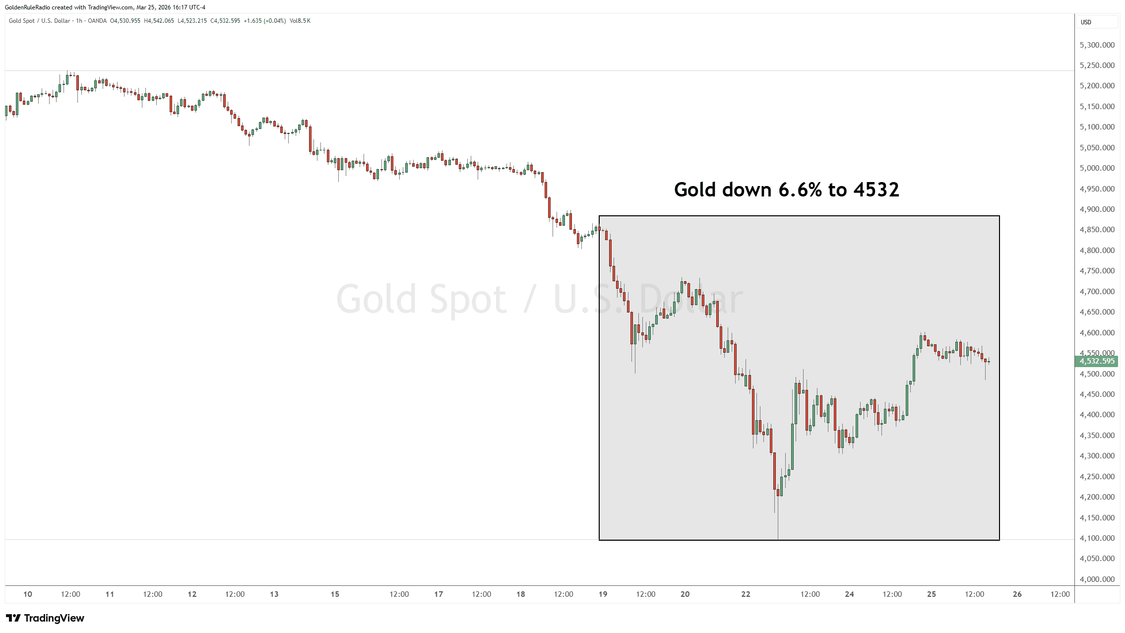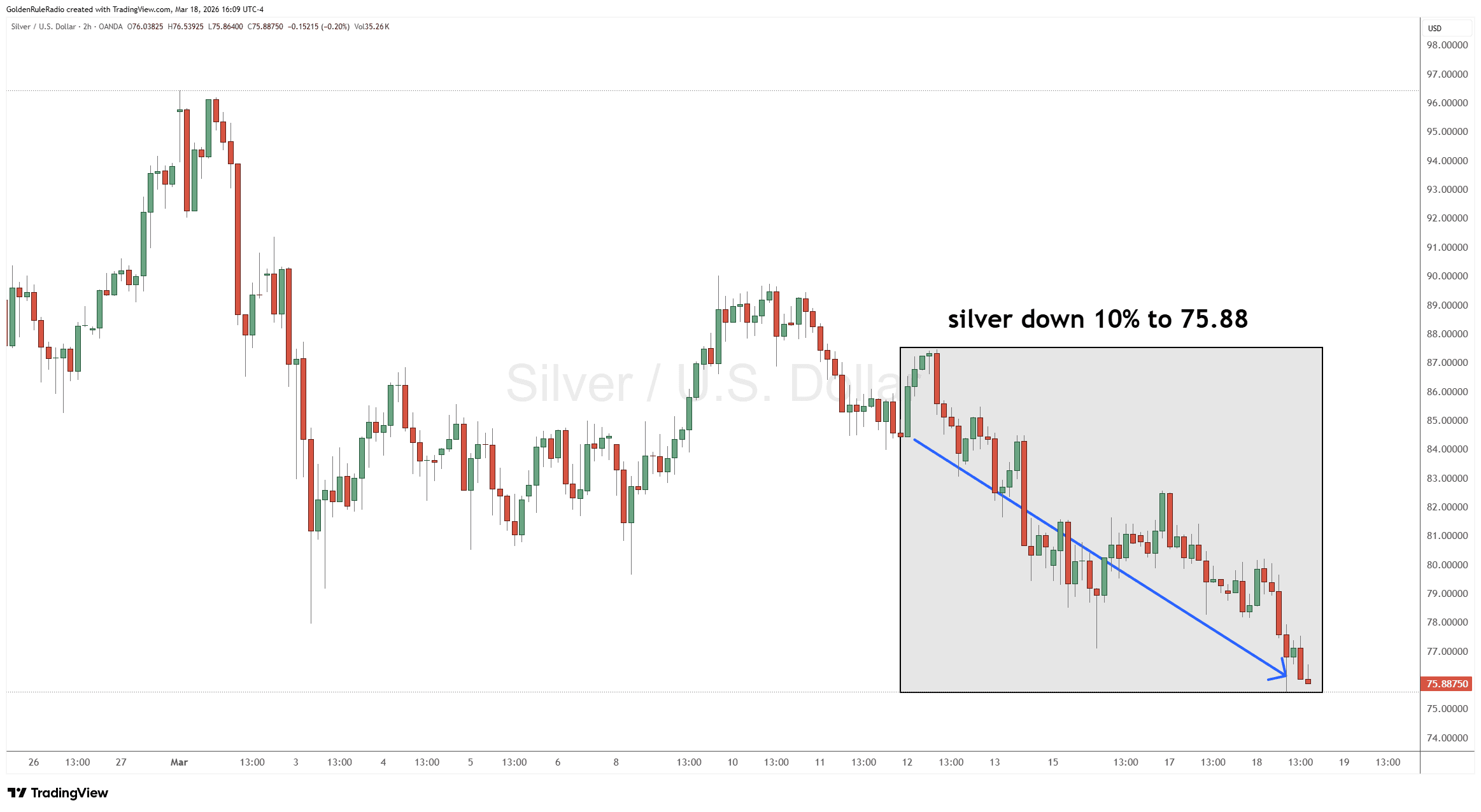 The price of silver is down 10%, sitting at $75.88. It is continuing its short-term slide down to the bottom of its trading range.